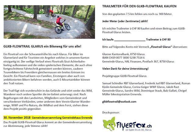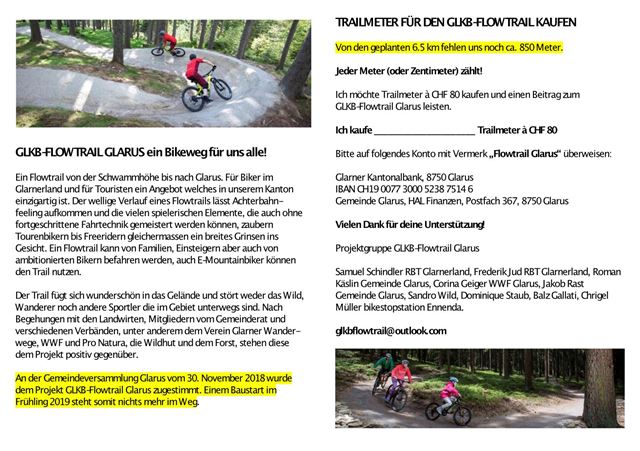 Der Gemeinderat Glarus hat das Projekt GLKB-Flowtrail auf die Traktandenliste der Gemeindeversammlung aufgenommen!