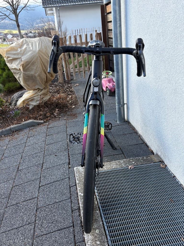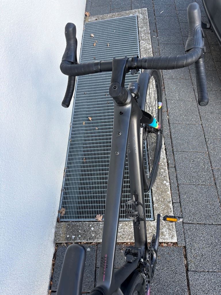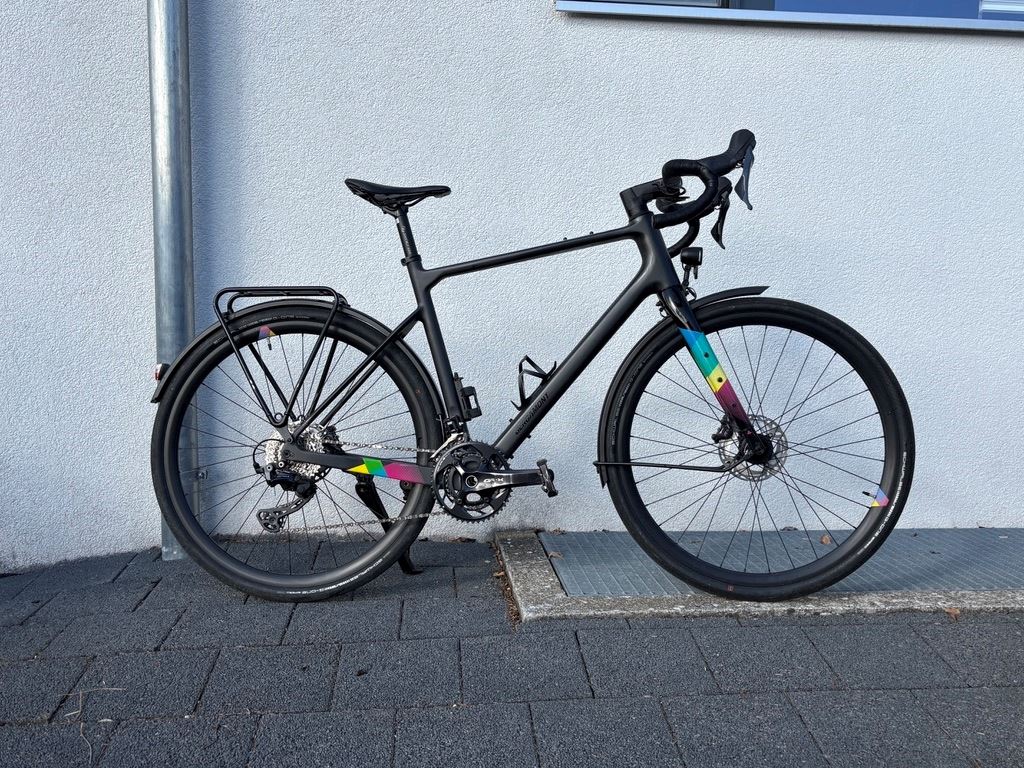 - Das Gravel wurde lediglich ein Jahr gefahren. 28", ultra lite HSC Carbon BGM Allroad Starrgabel, Carbon, Scheibenbremsaufnahme, Steckachse Shimano GRX, 2x12 Shimano GRX, hydraulische Scheibenbremse Syncros Capital Felgen, Shimano Nabendynamo Schwalbe G-One Speed, folding, 40-622 B&M IQ XS LED, 80 Lux / B&M Toplight LED