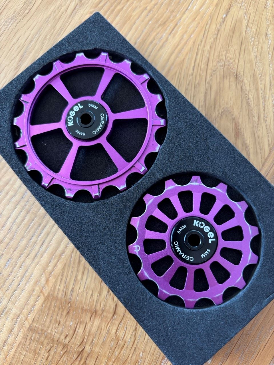 - verkaufe meine Kogel Bearing Ceramic Oversized Schaltröllchen für SRAM Eagle Transmission, da ich auf Ceramicspeed Schaltkäfig gewechselt habe Farbe: purple 1 Saison gefahren Das obere Schaltröllchen mit 14 Zähnen und das untere Schaltröllchen mit 18 Zähnen maximieren die Zahnanzahl um die Reibung zu verringern. Für die Montage: Eine längere Kette ist NICHT erforderlich. Anschließend muss das Schaltwerk lediglich feinjustiert werden. Kompatibel mit: - SRAM XX SL Eagle Transmission - SRAM XX Eagle Transmission - SRAM X0 Eagle Transmission - SRAM GX Eagle Transmission https://www.kogel.cc/products/14-18t-oversized-derailleur-pulleys-for-sram-transmission?variant=44833638449366