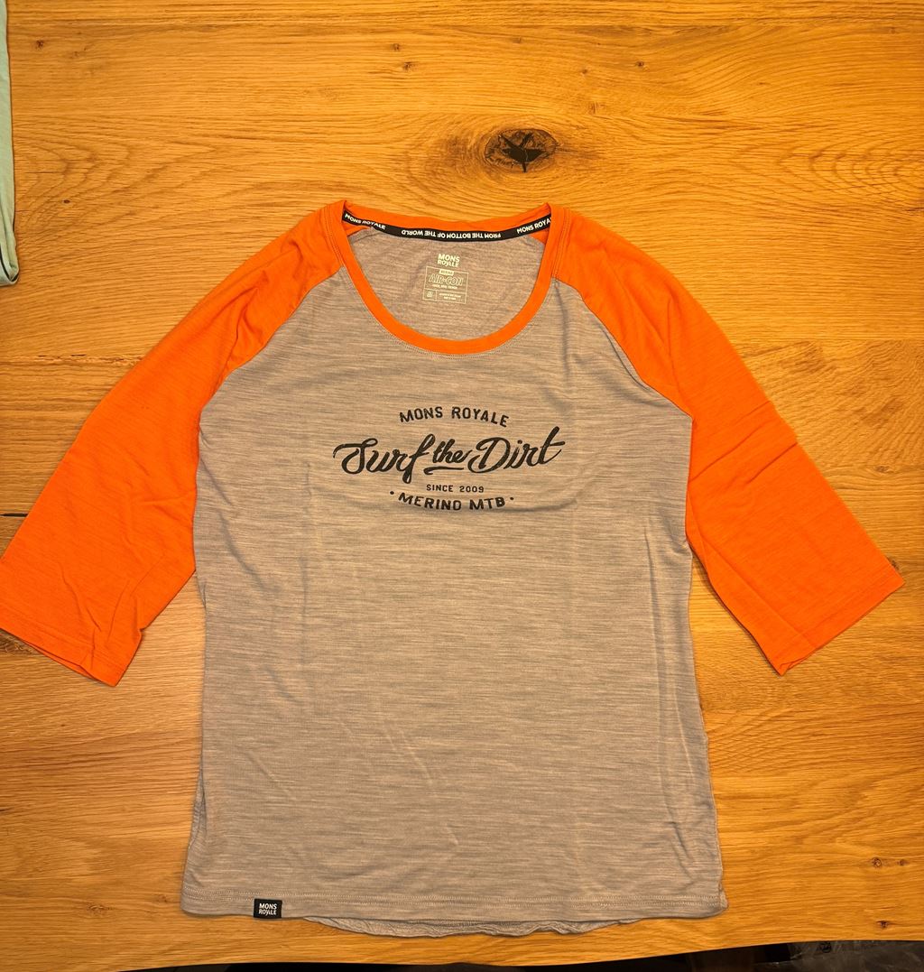 - Mons Royale - Surf the Dirt 3/4 Arm Shirt zum Biken oder für Freizeit Farbe: Hellgrau/ Orange Grösse: M Hinweis: 2 kleine Löcher (bin mal an einer Dorne hängen geblieben) und ein kleiner Fleck den ich nicht mehr rausbekomme. (Da Merinowolle nicht zu heiss gewaschen werden darf)