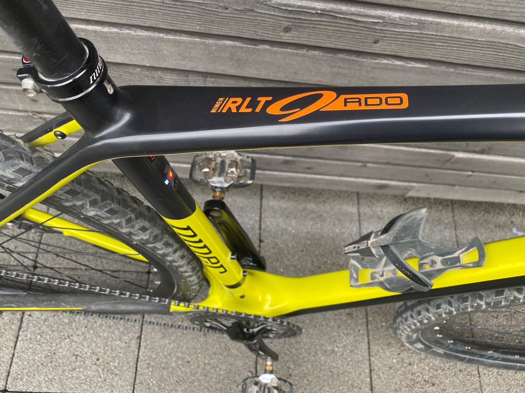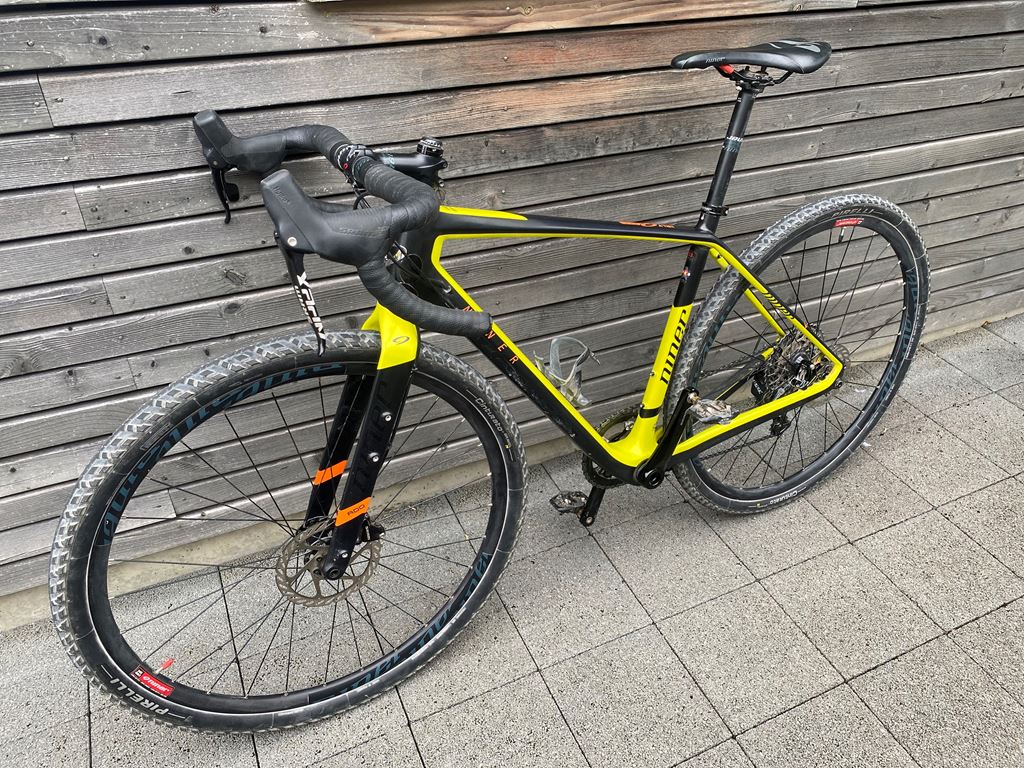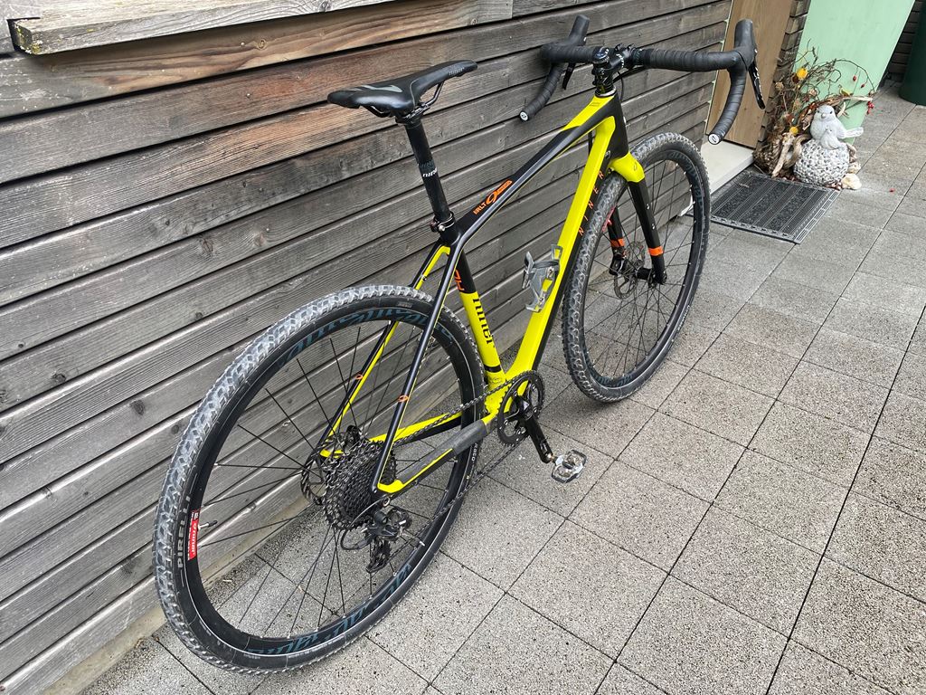 - Sportliches, hochwertiges und sehr robustes Gravel Bike mit Carbonrahmen und -gabel. SRAM Apex 1x11 Gruppe, Niner Komponenten. Klickpedale Shimano XTR inklusive. Die Pirelli-Reifen haben nur ca. 100km. Knapp 9.8 kg inklusive Pedalen und den relativ breiten, stark profilierten Reifen. Dazu gibt es neue Ersatzpneus (Pirelli), Bremsscheiben und -beläge. Niner fertigt ihre Gravelbikes nach MTB-Fertigungsstandards, womit auch Renneinsätze oder anspruchsvollere Trails inkl. kleineren Jumps kein Problem sind. Das Bike fährt sich auch im gröberen Geläuf angenehm komfortabel und ruhig. Sehr guter Zustand, leichte optische Gebrauchsspuren. Nur ca. 1500km gerollt, keine Stürze oder Rennen, kein Wintereinsatz. Funktionieren tut alles bestens, die hydraulischen Scheibenbremsen bräuchten in den nächsten Monaten mal einen Service (Ersatz Bremsflüssigkeit). Besichtigung und kurze Probefahrt möglich und erwünscht. Kein Versand. Privatverkauf, somit keine Garantie/Gewährleistung.