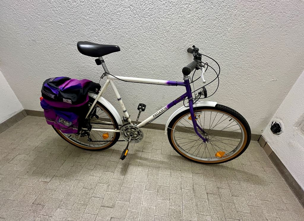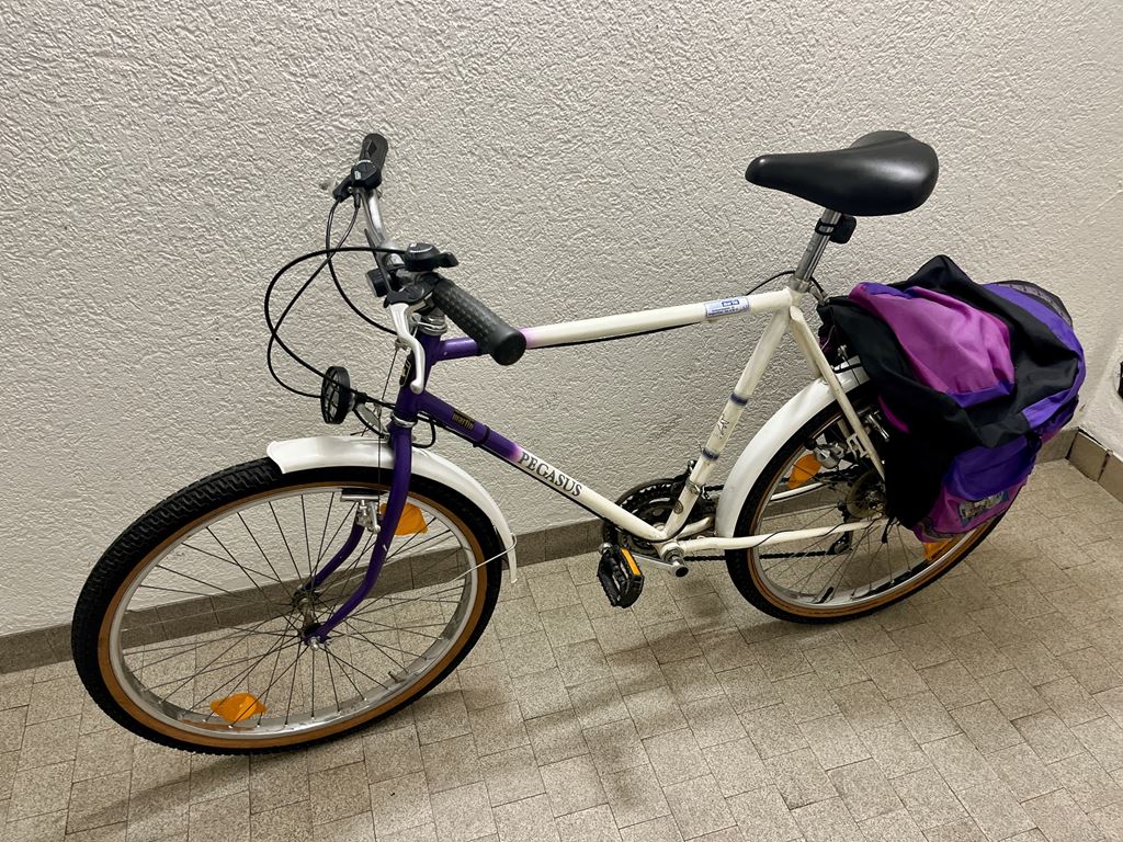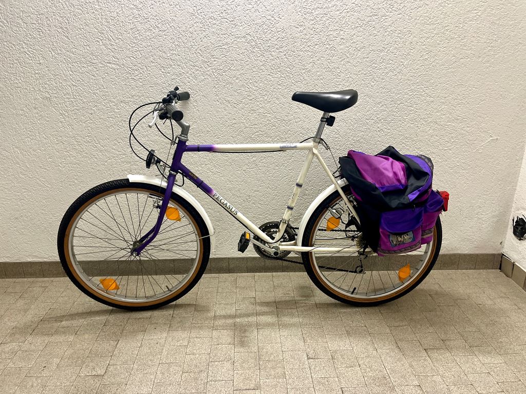 - Verkaufe mein zuverlässiges Pegasus Trekkingrad, Gravelrad in elegantem Weiss-Lila. Das Rad laeuft ruhig, schaltet sauber und ist perfekt für Stadt und Alltag. Details: Grösse (ideal für Personen ab ca. 1,65 m - 1.78 m) 21-Gang-Schaltung (Shimano) Leichtlaufende Reifen mit klassischem hellbraunem Rand Gepaecktraeger mit grossen, robusten Doppeltaschen in Lila/Schwarz Vollausstattung mit Lichtanlage, Reflektoren und Schutzblechen Bequemer Sattel, aufrechter Sitz Technisch und optisch in gutem Zustand Besonderheit: Schöner Retro-Look mit zuverlässiger Technik sofort startklar für den Alltag, Pendeln oder gemütliche Touren. Privatverkauf, keine Garantie oder Ruecknahme. Probefahrt möglich. Bahnversand 20.-