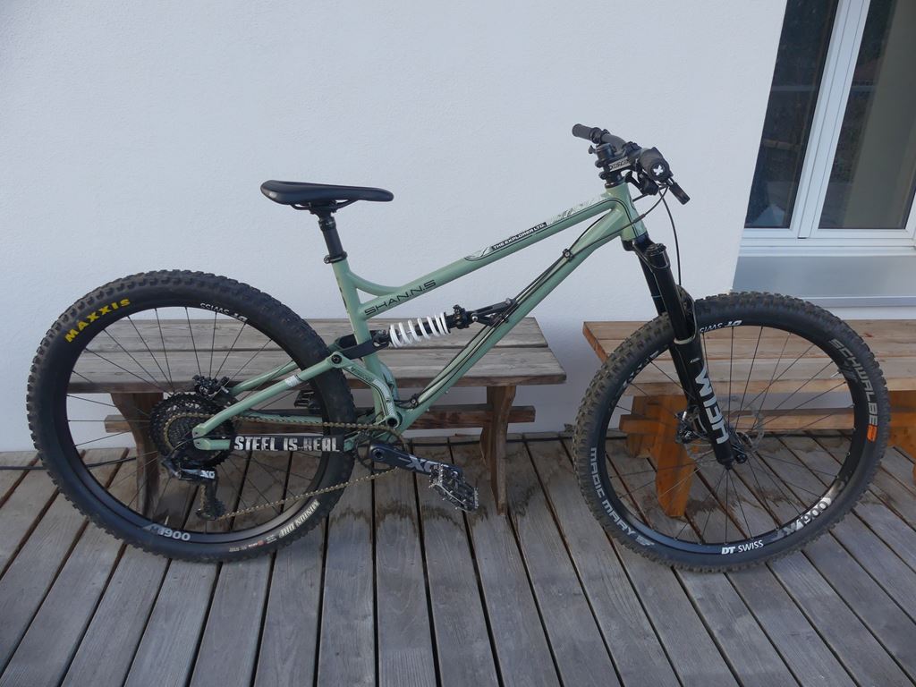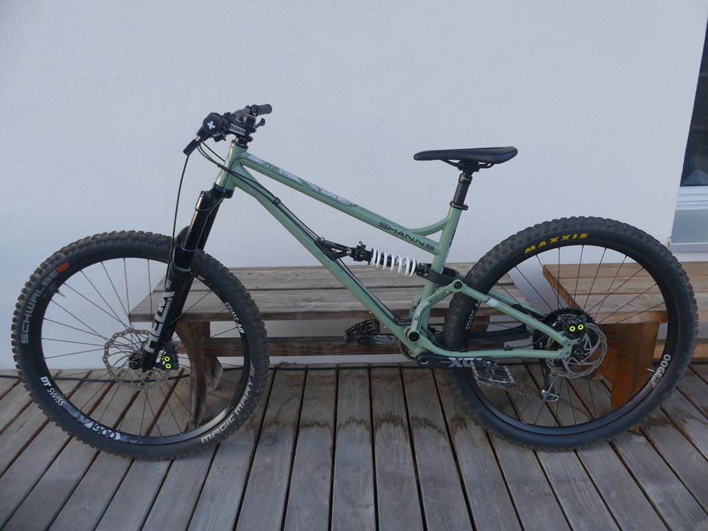 - Rahmen : Production Privée Rahmenset Shan 5 Grösse L Stahl Dämpfer : Cane Creek DB Coil Inline 210 / 55 Sattelstütze : Kind Shock Lev 170 mm Steuersatz : Production Privee Innenlager : Sram Dub