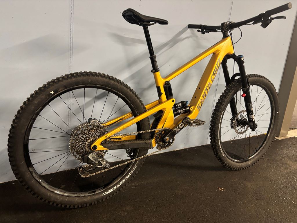 - Der CC Rahmen wurde 3 Saisons gefahren und befindet sich in einem gepflegten Zustand. Der Rahmen hat Invisiframe Schutzfolie drauf. Praktisch alle Teile ausser dem Antrieb sind Fabrikneu von einem anderen Neubike übernommen. Am Hinterbau links ist der Lack von der Fussferse auf einer Länge von 3-4 cm abgetragen. Beschreibung: - Santa Cruz Bronson CC V4 2022 Grösse M - FOX 36 Float Performance Elite Federgabel FABRIKNEU - FOX Float X Performance Elite Dämpfer FABRIKNEU - Sram X01 Carbon Kurbel - SRAM X01 Schaltung mit Kassette - RaceFace ARC 30 Laufräder FABRIKNEU - Schwalbe Magic Mary Gravity Radial / Schwalbe Albert Trail Radial NEU - Ventile: Reserve Fillmore Valves FABRIKNEU - Nabe vorne: SRAM MTH 716, 15x110, 6-Bolt, 32h FABRIKNEU - Nabe hinten: SRAM MTH 746, 12x148, HG, 6-Bolt, 32h FABRIKNEU - Bremsen SRAM Maven Bronze FABRIKNEU - Bremsscheibe vorne SRAM HS2 200mm FABRIKNEU - Bremsscheibe hinten SRAM HS2 180mm FABRIKNEU - Vorbau: Burgtec Enduro Stem, 42mm - Cane Creek 10 IS Integrated Headset FABRIKNEU - Lenker: Sixpack Milenium NEU - OneUp Dropper Post FABRIKNEU - Santa Cruz Bicycles House Grips - SDG Belair 3 FABRIKNEU - OHNE PEDALE