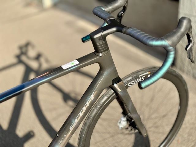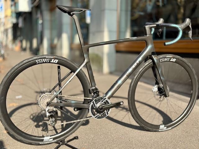 - Wir verkaufen dieses Einzelstück als absolutes Top-Rennvelo. Rahmen: Scott Addict RC Ultimate HMX Grösse: Large / 56cm Farbe: sunbeam black Gewicht: 6.6kg Neupreis: CHF 13`532.- Cockpit: Syncros IC-R100-SL, Breite: 400mm, Länge: 100mm Schaltung: SRAM RED E1 (neuste Version), 2x12 AXS elektronisch Kurbel: SRAM RED E1, 172.5, 46/33 Kassette: SRAM RED E1, 12-fach, 10-33 Sattel: Syncros Belcarra R SL Carbon Radsatz: DT Swiss CRC 1400 Carbon Reifen: Continental Grand Prix 700x32 Rotor: SRAM Centerline 160mm inkl. Ladegerät und allen Batterien. Lenkerband: Ciclovation Cosmic Haze