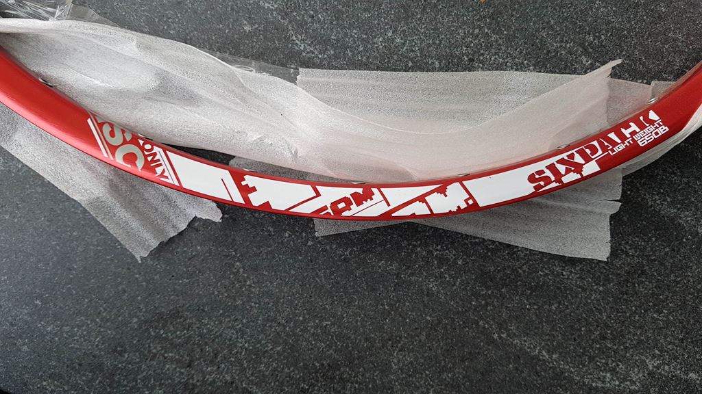 - Neue Felge Achtung die rote Eloxfarbe ist tendenziell heller als andere rote Eloxalteile. Zudem ist zu beachten dass die Felge für Autoventile gebohrt ist und es beim Abdichten für Tubeless auf die richtige Ventilreduktion zugegriffen wird