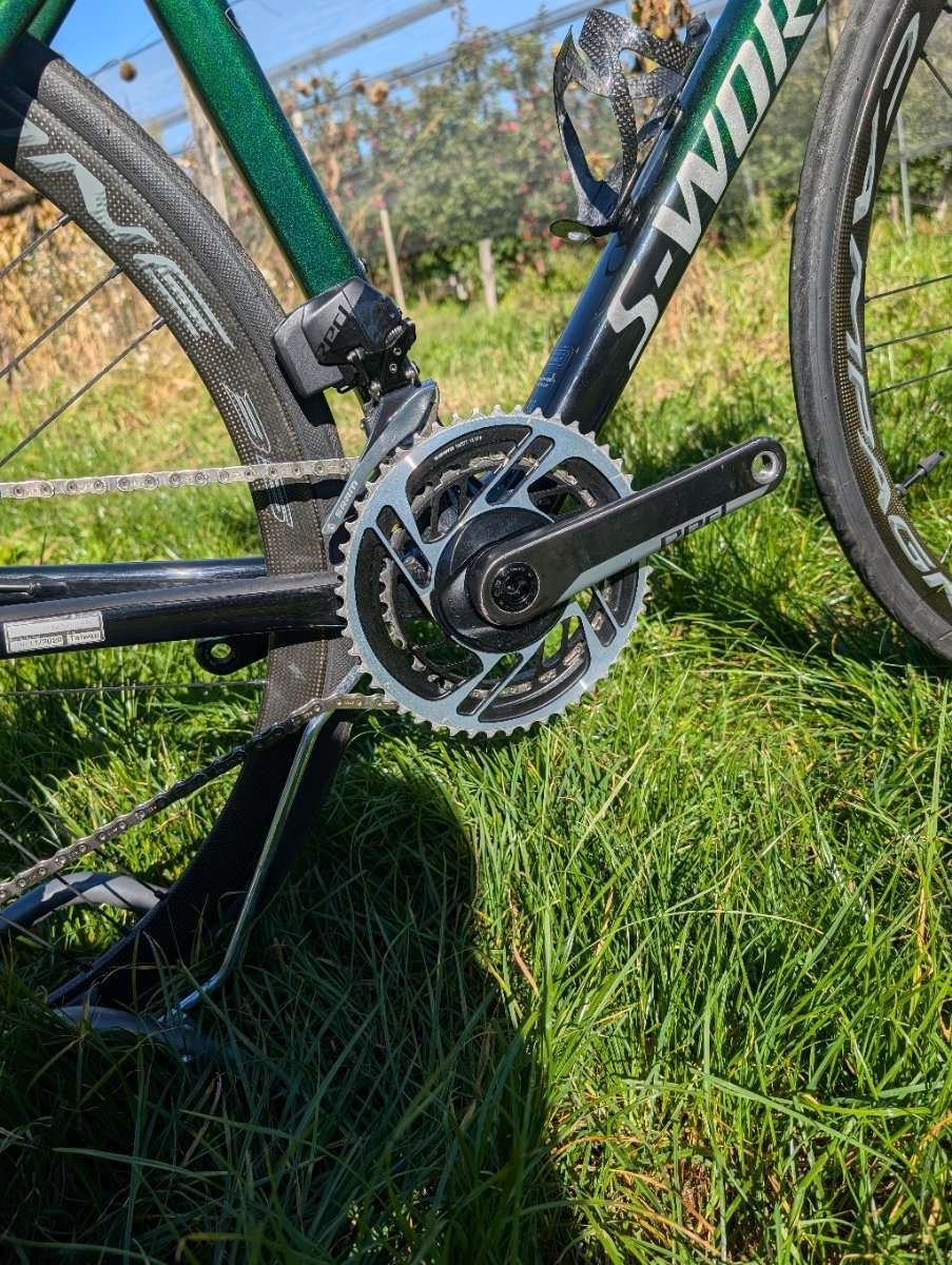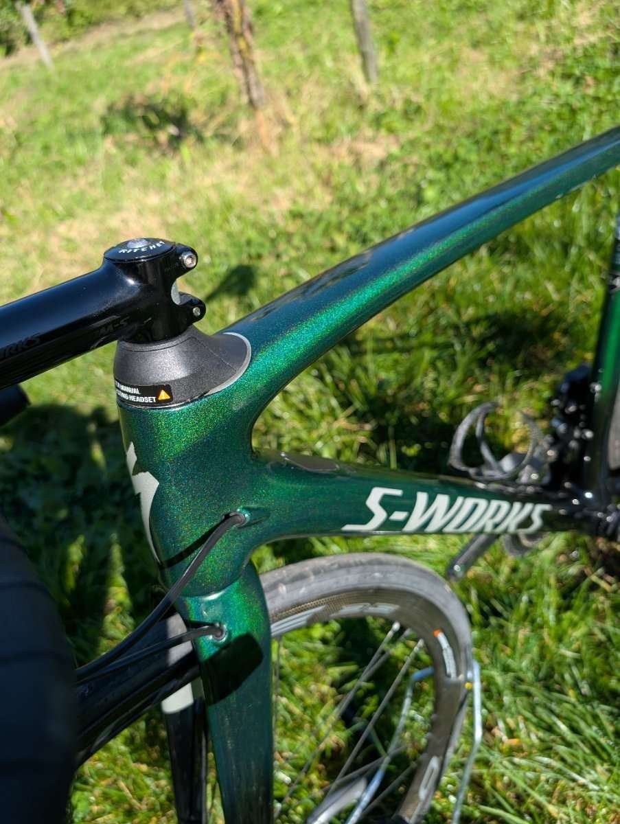 - I'm offering my wonderful and beautiful Specialized S-Works SL7 Roubaix for sale. The frame is scratch-free and has been meticulously cared for. The brake levers, derailleur, and crankset have minor scratches. - Color (Gloss Green Tint/Spectraflair/Satin Flake Silver) - Frame size 54 (EU) - Groupset/Brakes/Derailleur: SRAM Red AXS - Brake rotors: SRAM CLX-R 160mm - Rims: Campagnolo Bora One 35, scratch-free - Tires: S-Works rear and Ykstion Pro UST 2 front (new) - Headset and bottom bracket by CeramicSpeed - Handlebars and stem: S-Works - Carbon bottle cage - Saddle: Prologo Dimension 143 The Specialized Future Shock has been removed and replaced with a standard (non-suspension) headset. Future Shock and the associated stem are included, along with the charger for the Sram Red drivetrain.
