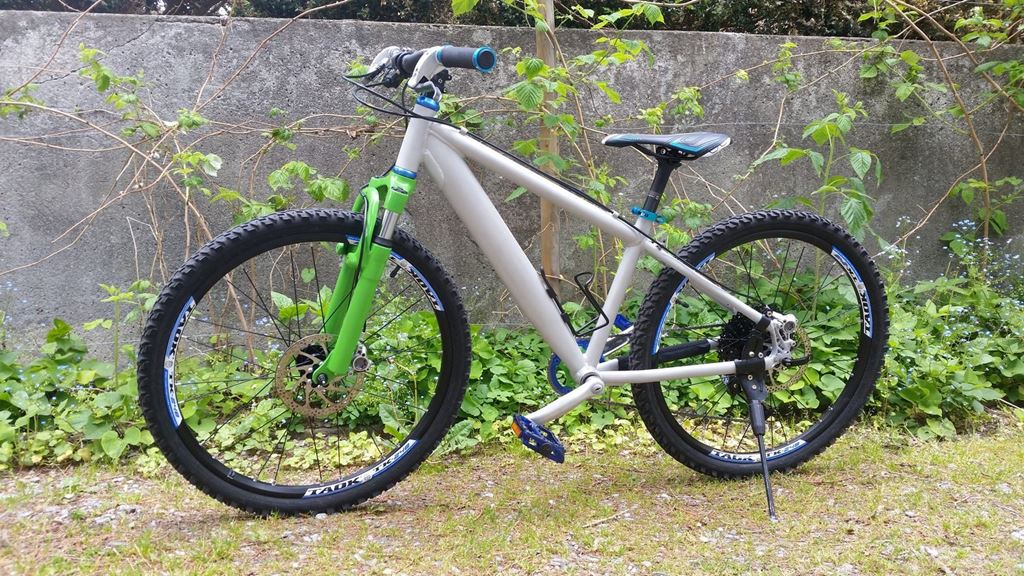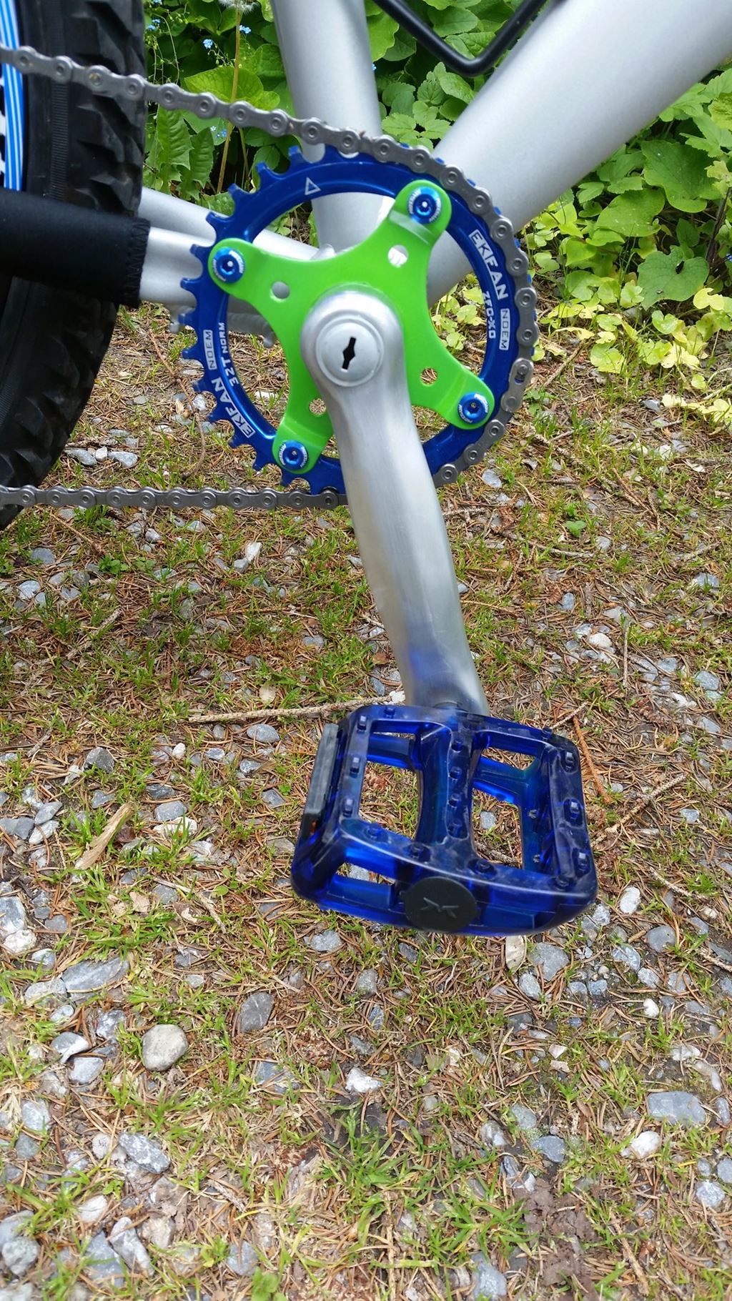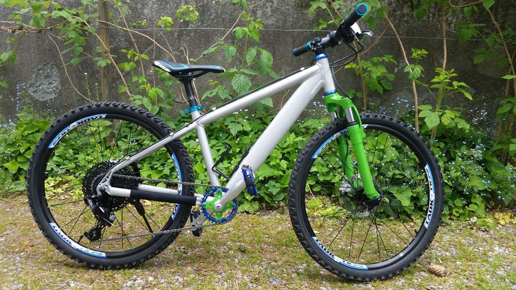 Habe meiner Tochter ein Kinderbike aufgebaut. Gabel und Rahmen waren ursprünglich schwarz. Die Kurbel hatte drei Stahl Kettenblätter. Diese habe ich abgesägt und gefeilt und gebohrt und mit einem narrow-wide Kettenblatt versehen.