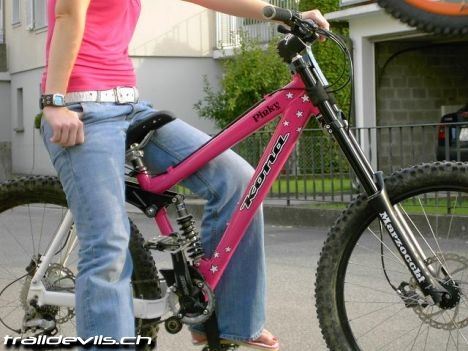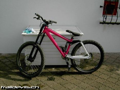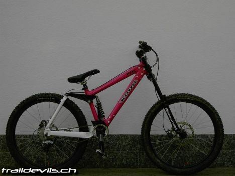 Das Bike ist ein 04er Stinky in gr. s. Gewechselt haben wir die Bremsanlage gegen eine neue HFX 9 von Hayes, einen XT Wechsler, eine Truvativ Boxguide, ein neuer Sattel, Lock on Grips und Crankbrothers 50/50* Pedalen. Der Rahmen wurde Sandgestrahlt und neu Lackiert, danach kamen die neuen Schriften drauf und fertig war die Pinky Maschine!