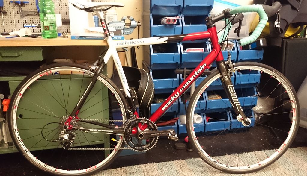Selbst aufgebaute Rarität (Rocky Mountain stellt keine Rennräder mehr her...) mit SRAM Force/Red-Teilen, sowie Easton Carbonparts und DT SWISS "Mon Chasseral"-Laufrädern. Rahmen aus Alu, Hinterbau aus Carbon. Erstaunlich leicht geworden, das Teil - 7,6kg mit Pedalen : )