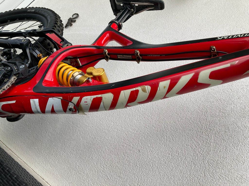 kleiner Materialfehler beim Hinterbau Bike in sehr gutem Zustand, regelmässige Wartung in der Spezialized Wekstatt Zusätzlich 2 Pneu Bremsen: TRP Quadiem 4 Kolben Dämpfer: Öhlins 200mm Gabel: Rockshox Boxxer 200