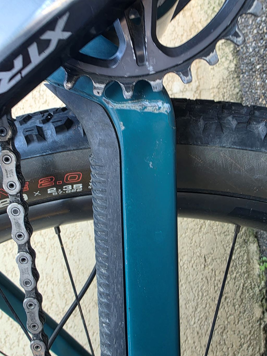 - 2022 Transition Spur frame. Size medium. Covered in Invisiframe. Too many bikes, not enough time. Only one scratch where the chain got stuck between the chain ring and the frame. See photo.