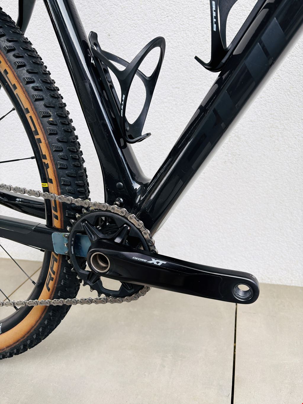 - SPEZIFIKATIONEN & HIGHLIGHTS Rahmen: Super lite carbon fibre monocoque (Nur 900g in Größe M). Gabel: RockShox SID SL Select+ (100 mm Federweg). Schaltung: Shimano Deore XT 12-Gang (mit SLX 10-51T Kassette). Bremsen: Shimano XT BR-M8100 Hydraulik-Disc (180mm Scheiben). Laufräder: MAVIC E-Crossmax 29" Centerlock. Reifen: Schwalbe Racing Ray / Racing Ralph Evo Super Race (57-622). Cockpit: Rumble Altimate 35 Flat Top Lenker & FSA Carbon Sattelstütze. Gewicht: Ultraleichte 10,3 kg (Zulässiges Gesamtgewicht 125 kg).