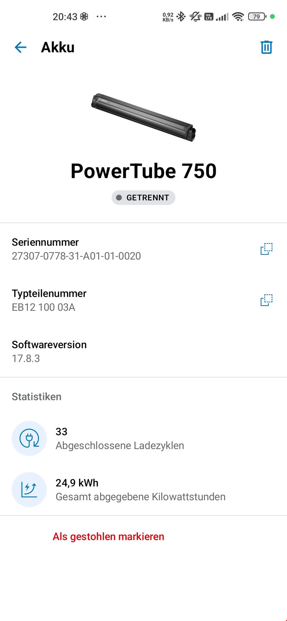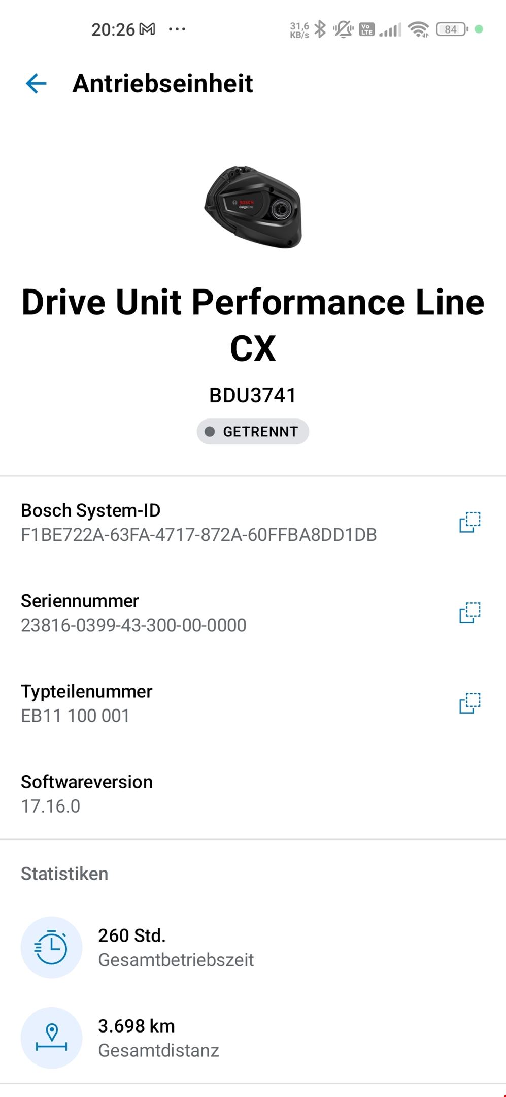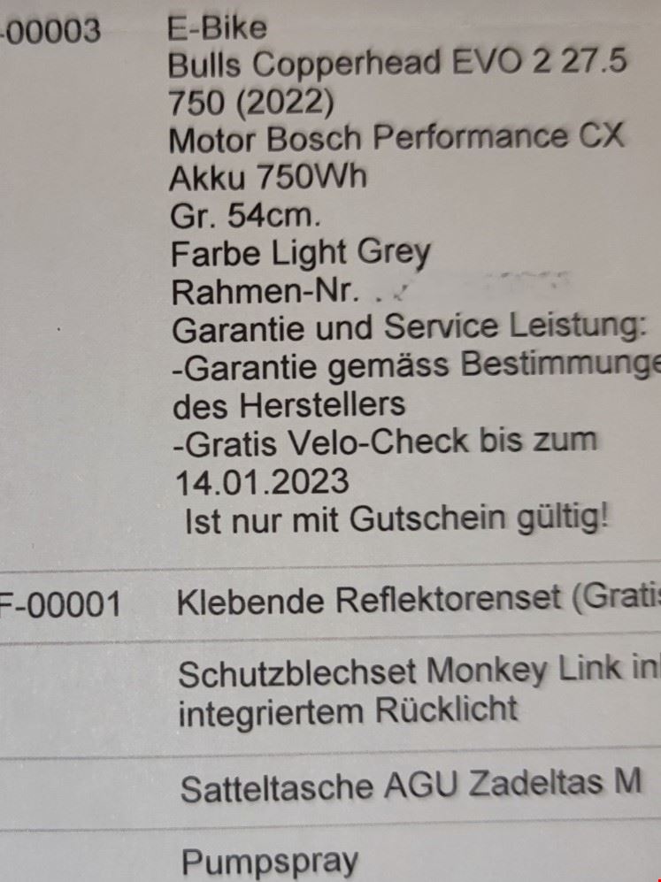 - Highlights aus dem System-Check (siehe Screenshots): Laufleistung: Erst 3.698 km Gesamtdistanz. Akku-Zustand: Großer 750 Wh PowerTube mit erst 33 vollständigen Ladezyklen – der Akku ist also noch fast neuwertig! Motor: Bosch Performance Line CX (Smart System) mit 85 Nm Drehmoment. Technische Details: Modell: Bulls Copperhead EVO 2 XC. Laufradgröße: 29 Zoll (Ryde Disc 30 Felgen / Schwalbe Smart Sam Bereifung). Gabel: SR Suntour LOR Air (Luftfedergabel) mit 15x110 Boost Steckachse. Bedienung: Bosch LED Remote. Zustand & Wartung: Service: Frisch durchgeführt. Verschleiss: Die Bremsbeläge wurden im Rahmen des Service komplett ersetzt. Gebrauchsspuren: Es gibt optische Gebrauchsspuren an der Sattelseite beim Wechsler (Schaltwerk). Hinweis für Käufer: Das Vorderrad hat aktuell eine Unwucht ("Achter"). Je nach Anspruch sollte die Felge zentriert oder ggf. ersetzt werden. Dies wurde im Preis bereits berücksichtigt. Lieferumfang: Bulls Copperhead EVO 2 XC (Jahr: 2022) Original Bosch Ladegerät. 1 Schlüssel für den Akku (es können Schlüssel nachbestellt werde, da Schlüssel Code vorhanden) Licht: Monkey Link Skye Light Bidonhalter: Monkey Link Schutzblechset: Monkey Link Satteltasche: AGU Zadeltas Klick Fix