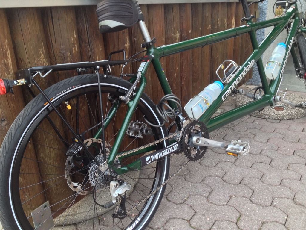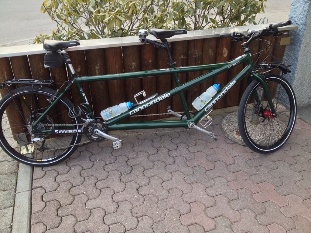 - Tandem Cannondale MT 800 mit sehr stabilem Alu-Rahmen Rahmengrösse vorne L, hinten M. Mit Shimano Downhill Saint Scheibenbremsen, Scheibengrösse 203 mm Und zusätzlichen V-Brake Bremsen als zusätzliche Sicherheit Shimano XT 3 x 8-fach Schaltung Handgebaute Räder Mit Gepäckträger vorne und hinten Continental Strassenbereifung Auf Wunsch mit Sacoschen für vorne und hinten.