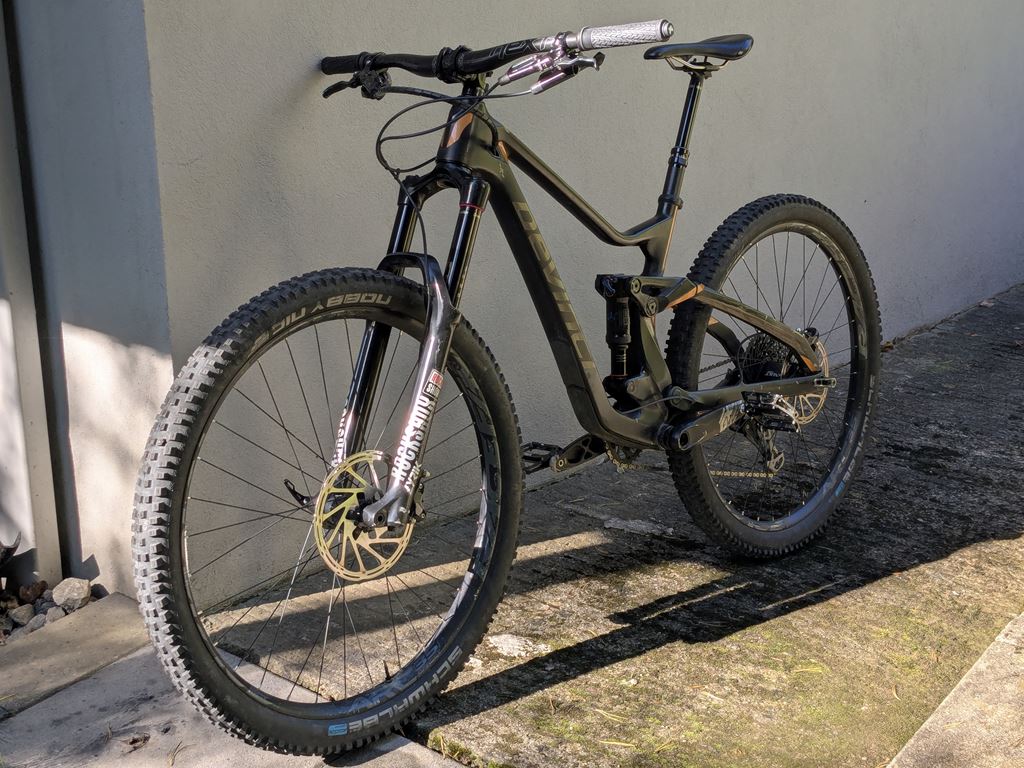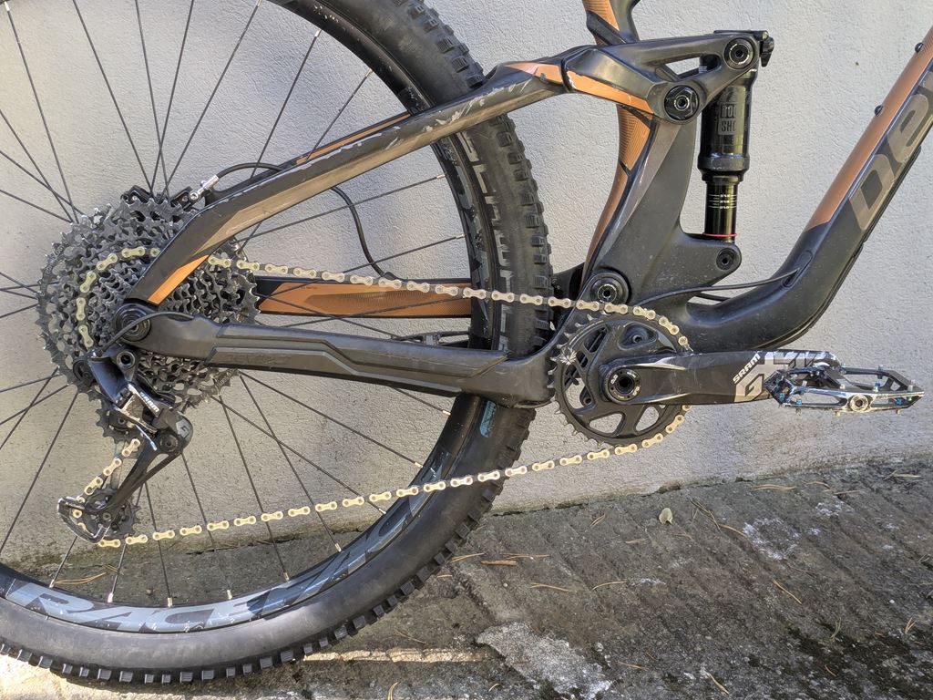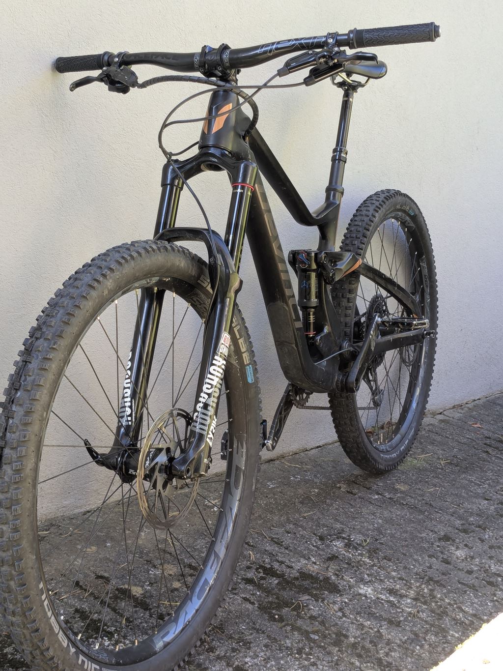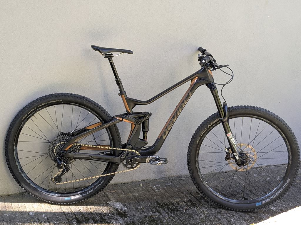 - Ich verkaufe hier mein schönes Devinci Troy carbon 29’’ in der Grösse M (ich bin 175cm gross). Es ist ein «all mountain» Bike mit 160mm Federweg vorne und 140 mm hinten. Das Bike befindet sich in einem guten Zustand, mit den üblichen Gebrauchspuren. Bei den Bremsen wurden die Beläge und die Flüssigkeit ersetzt. Die Griffe sind auch neu. Carbon Rahmen: Grösse M Federgabel: Rockshox Lyrik Charger 2 RC2 160mm Dämpfer: RockShox Deluxe RT3 Debonair Schaltungs-Set: SRAM Eagle GX Eagle 1x12 Bremsen: SRAM Guide RSC Felgen: RaceFace AR35 Offset 29’’ | 35mm inner Reifen: SCHWALBE Nobby Nic Sattelstütze: RockShox Reverb Sattel Ergon Lenker: Raceface Next R Carbon ohne Pedale