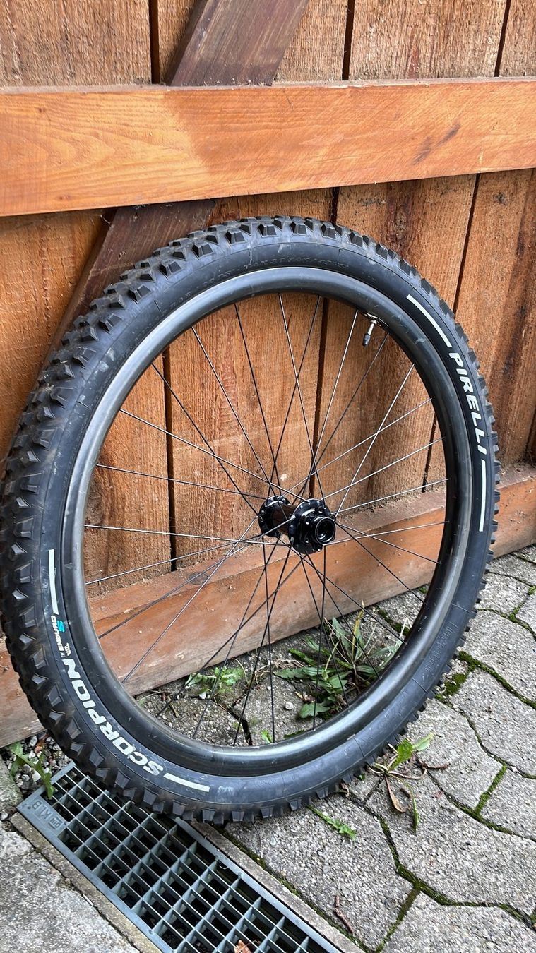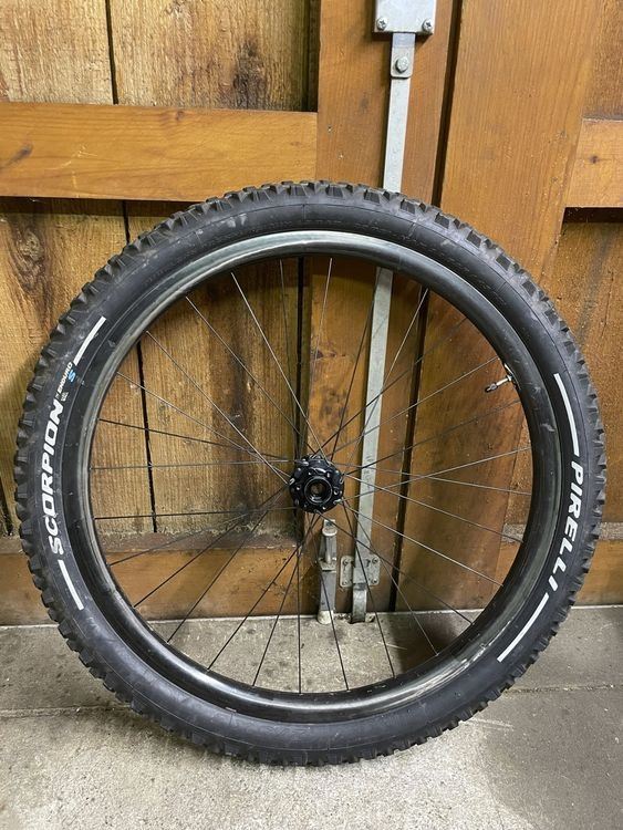 - Da das Fahrrad auf ein Mullet umgebaut wurde, ist das Laufrad abzugeben. Es sollte sich um eine ENVE M50 Felge aus dem Jahr 2018 handeln (ohne Decals). Die Felge hat ausser optischen Kratzern keine Schäden und läuft Rund (siehe Bilder). Das Laufrad wurde nicht für grobe Beanspruchung gebraucht. (keine Sprünge) Es ist eine Industie Nine Nabe verspeicht. 6-Loch Boost Standard 110x15 mit neuen SKF Lagern welche exta noch gewechselt wurden. Beim Pneu handelt es sich um einen Pirelli Scorpion. Es ist ein Schlauch verbaut. Bei Versand, müsste ich noch eine passende Schachtel organisieren.