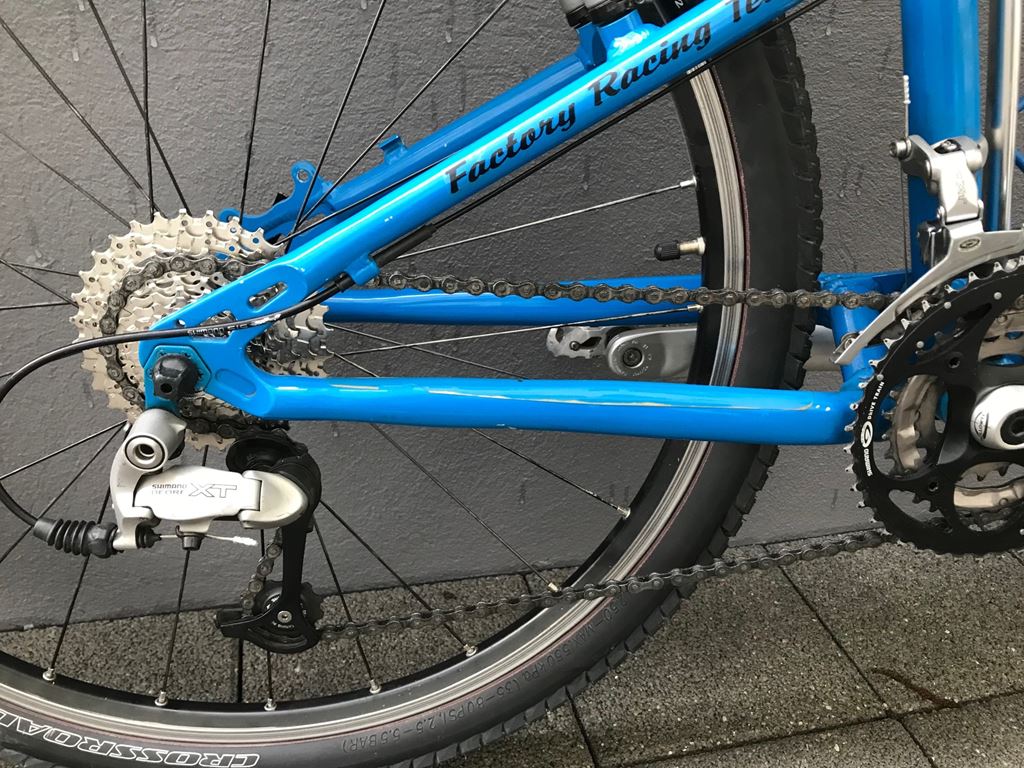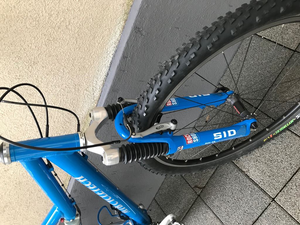 - Biete wegen Sammlungsauflösung: 1 x MTB Cycletech "Stinger" Team - Fully MTB: Original Zustand -> Mehr Schweizer Mountainbike Kult geht kaum! Farbe: *Factory Racing Edition* in sehr schönem SID blau Jahrgang 2001, delveloped by Butch Gaudy, MTB Cycletech Bern Grösse: Medium (480mm) Zur Ausstattung: Stinger Fullsuspension EASTON Ultra Elite (6061-T6) Aluminium Rahmen, made in Taiwan Tioga IS- Steuersatz 1 1/8" Ahead Rock Shox SID Dual-Air XC Federgabel, mit ca. 60mm Federweg DMR Air Luftdämpfer 40mm Federweg Shimano XT M750 3x9 27 Gang Schaltung (mit neuer Kette) Avid SD V-Bremsen mit neuen KoolStop All-weather Bremsbelägen IRC Mythos XC 2.1 Reifen vorne, Specialized Crossroad 1.9 hinten 26" NoPogo Wheels mit CITEC Naben mit spezieller Speichung, made in Germany Dieses Stinger war das legendäre Vorgängermodell vom MTB Cycletech "Opium", diese Team-Variante ist in einem äusserst guten Zustand, ab Service, kleinere Kratzer vom Lagern vorhanden. Es stammte ursprünglich vom VELO RACE Laden in Bern. Also ideal für Bike Fans der Schweizer Kult Marke MTB Cycletech oder für alle Mountainbike Enthusiasten. -> Probefahrt und Abholung (gegen Barzahlung) in ZH Kreis 10