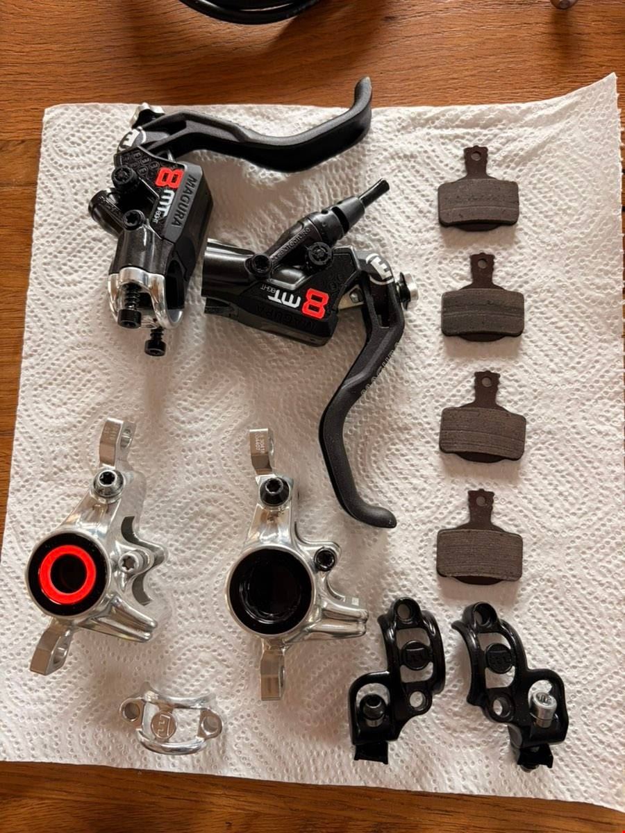 - Verkaufe Set einer Magura MT8 Pro! Dabei ist alles wie auf dem Foto. HR-Bremse 1 x benutzt. (gekauft im April 2026) VR-Bremse 1 Jahr in Verwendung Geber 1 x (ich dachte er ist undicht) Bremssattel 1 x (Leitungsschraube abgebrochen) Bremsleitung 180 cm Bremsleitung 220 cm Matchmaker für SRAM AXS links und Rechts Bremsscheibe 180 mm 1 x benutzt Diverse Pins und Olive und Ersatzschrauben 2 x Set Bremsbacken 1 x benutzt Entlüftungskit Verkaufe die Bremse wegen Umstieg auf SRAM