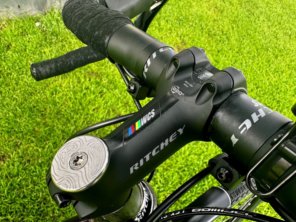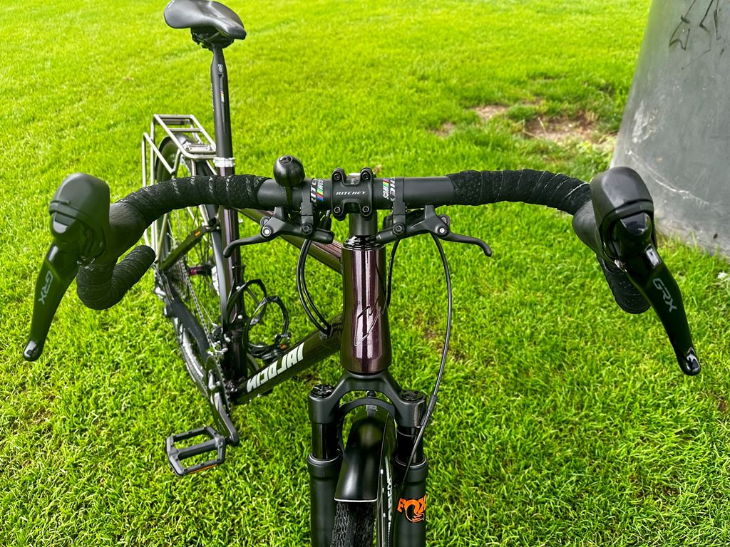 - Nicolai Argon GX aus 7020-T6 Aluminium Fox Federgabel TC 32 DT Swiss Custom Radsatz mit 240er Ratchet EXP Nabe hinten und 240er Nabe vorne. GRX 2 x 10 Antrieb mit Spezialumbau auf 11-42 Kassette welche knackig schaltet dank dem XT Schaltwerk und dem Wolftooth Adapter möglich. (siehe Foto) Lenker und Vorbau von Ritchey WCS Alu Version. Sattelstütze Richtey Flex Logic Carbon WCS Version Gepäckträger Tubus Logo Classic Edelstahl Schutzblech Curana (sehr leicht) 4 Hydraulische Bremshebel von GRX Bremssättel hinten und vorne ohne Adapter Hope RX 4 Bremsscheiben Swissstop Catalyst Pro