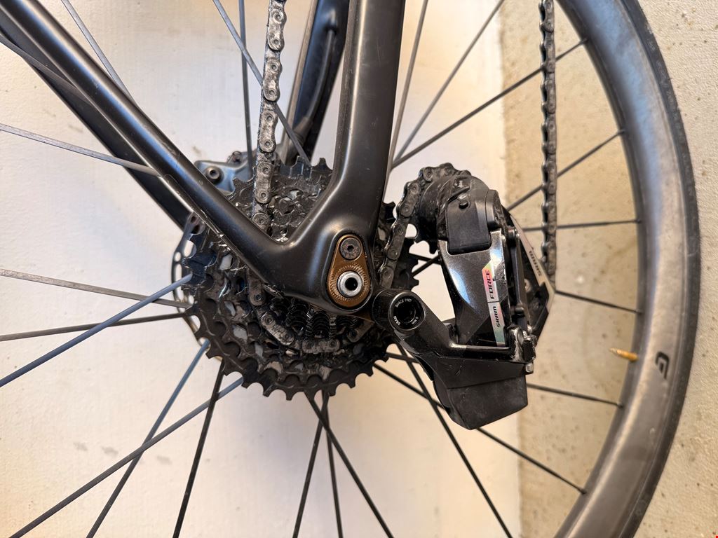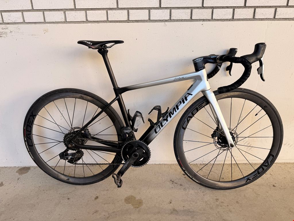 - Olympia Leader Rennrad – Größe 52 * Größe 52 (geeignet für Körpergröße 165–172 cm) * Vollcarbon-Rahmen mit vollständig integrierter Kabelführung * SRAM Force AXS Schaltgruppe – 2x12-fach elektronisch. (With quarq powermeter) * SRAM Force hydraulische Scheibenbremsen * Cadex 36 Carbon-Laufräder * Selle Italia SLR Carbon Sattel * Gewicht: 7,9 kg (wie auf den Fotos gezeigt, inkl. Pedale, zwei Flaschenhalter und Garmin-Halterung) Leichtes, leistungsstarkes Rennrad mit sauberem, voll integriertem Setup. Perfekt für Fahrer, die Wert auf Geschwindigkeit, Steifigkeit und moderne Komponenten legen