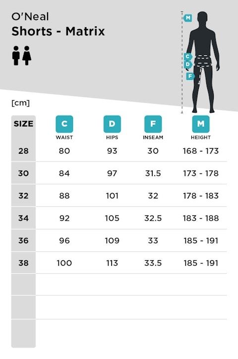 - Mit den O'Neal Matrix MTB-Shorts bekommst du High-Performance-Gear, das dich zuverlässig vor Verletzungen sowie Wind und Wetter schützt. Eigenschaften: • Schutz trifft auf Komfort • Besonders sicherer Sitz • Seitentasche mit Reißverschluss Grösse 34 Zwei Stück verfügbar 30.- pro Stück