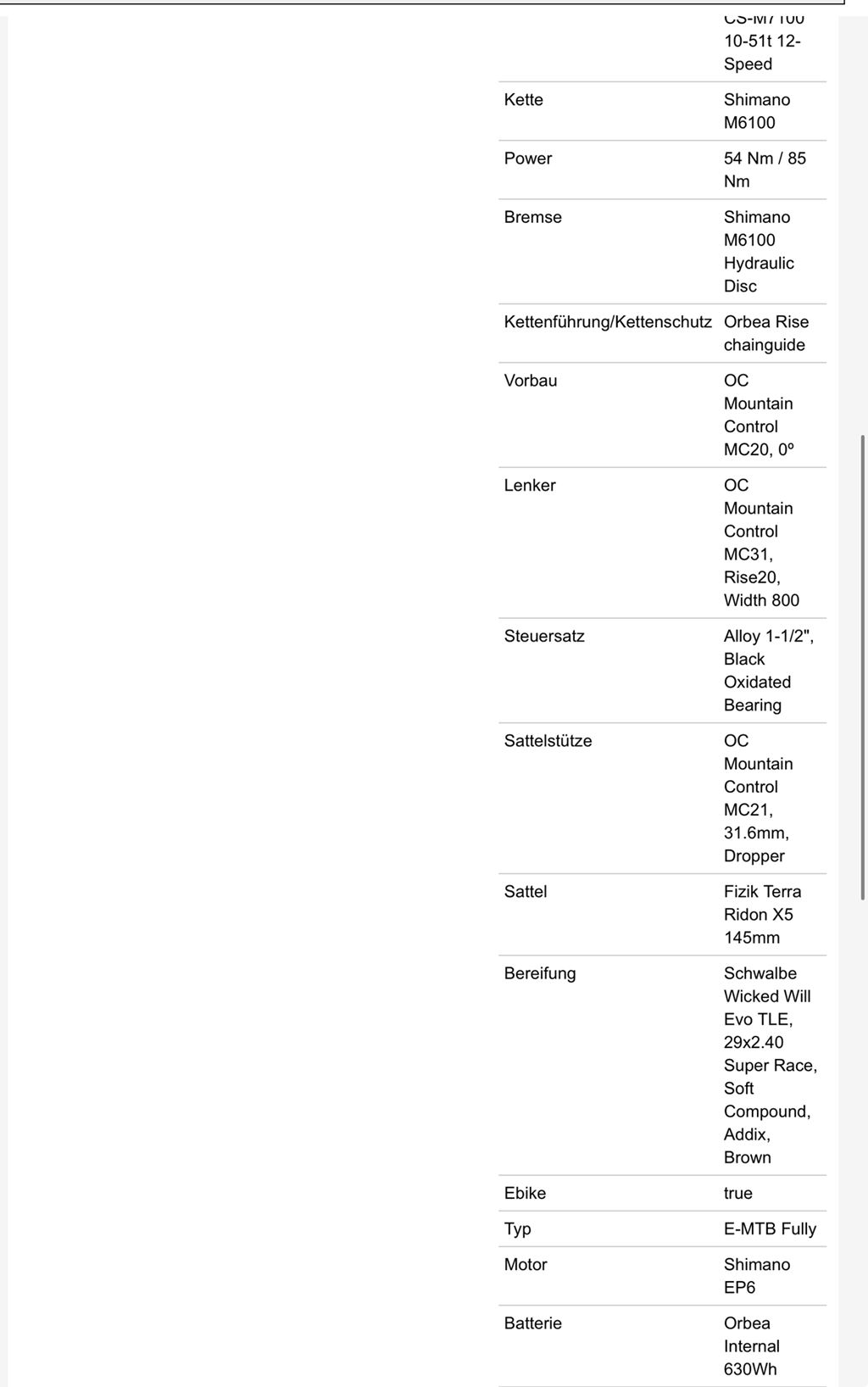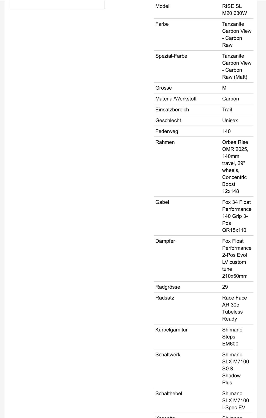 - 2025 Orbea Rise SL M20 Test Bike - Top Zustand Total 376km Rahmengrösse Medium Spezial-Farbe Tanzanite Carbon View - Carbon Raw (Matt) Batterie Orbea Internal 630Wh Power 54 Nm / 85 Nm Shimano Display Rahmen Orbea Rise OMR 2025, 140mm travel, 29" wheels, Concentric Boost 12x148 Federweg 140mm Gabel Fox 34 Float Performance 140 Grip 3-Pos QR15x110 Dämpfer Fox Float Performance 2-Pos Evol LV custom tune 210x50mm