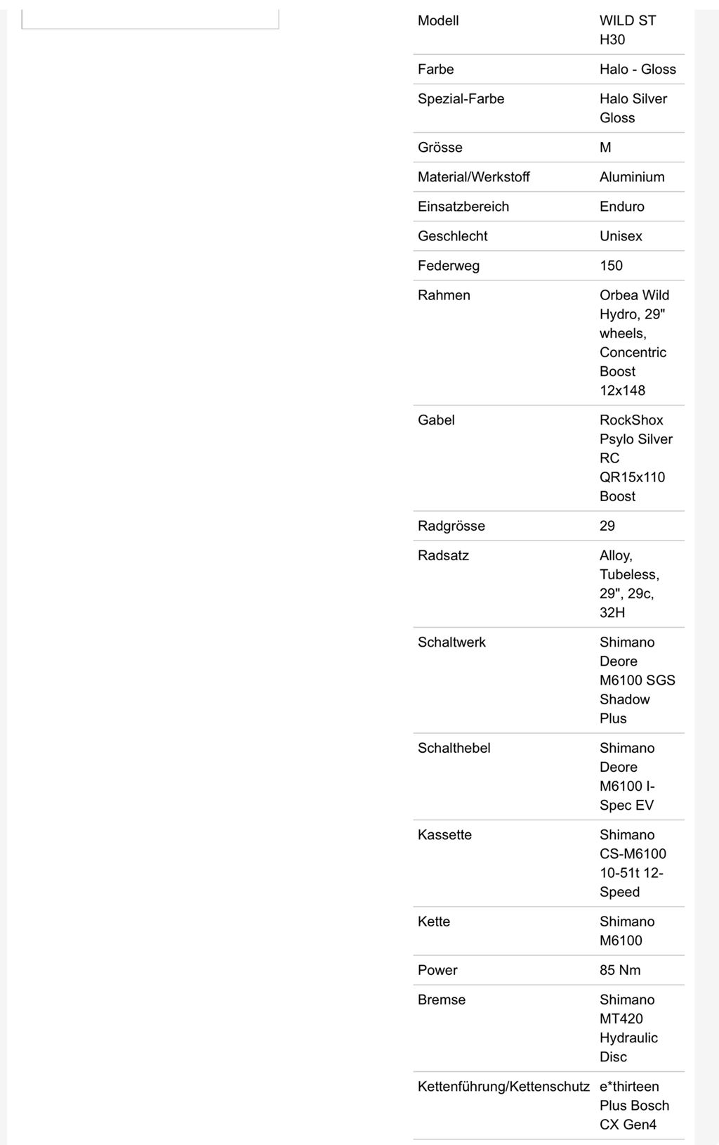 - 2025 Orbea WILD ST H30 Test Bike - Top Zustand Total 281km Rahmengrösse Small Federweg 150mm Rahmen Orbea Wild Hydro, 29" wheels, Concentric Boost 12x148 Gabel RockShox Psylo Silver RC QR15x110 Boost Motor Bosch Performance Line CX BDU3840 Batterie Bosch Powertube 600Wh Horizontal BBP3860 Display Bosch System Controller BRC3100 E-Bike Frontlicht verbaut