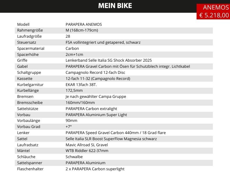 - Ultraleichtes Carbon-Gravelbike PARAPERA Modell "Anemos" in Grösse M abzugeben Laufleistung weniger als 1000 km, gekauft im März 2025, seit Juli 2025 nicht mehr gefahren knapp 8 kg Testberichte: https://www.radfahren.de/test-technik/parapera-anemos-gravel-test/ DIESES GRAVELBIKE BRINGT DICH ÜBERALL HIN Anemos [ánemos], der Wind Mit diesem Gravelbike hast du unendlich viele Möglichkeiten. Es ist ein Rad für die Langstrecke, für Radreisen, für den Weg zur Arbeit - für alles. Du kannst dein Anemos mit jedem Zubehör von PARAPERA ausstatten - vom dritten Flaschenhalter über Schutzbleche bis hin zum leichten Fahrrad-Gepäckträger, sogar ein Fahrradlicht ist optional möglich. Hinzu kommt eine maximale Reifenbreite von 50 Millimetern. Deine Optionen sind grenzenlos, genau wie der Einsatzbereich. Mit dem Anemos bist du autark und kannst allein die Welt erkunden. Du musst nur aufsteigen und losfahren. Ausstattung: Modell PARAPERA ANEMOS Rahmengröße M (168cm-179cm) Laufradgröße 28 Steuersatz FSA vollintegriert und getapered, schwarz Spacermaterial Carbon Spacerhöhe 2cm+1cm Griffe Lenkerband Selle Italia SG Shock Absorber 2025 Gabel PARAPERA Gravel Carbon mit Ösen für Schutzblech integr. Lichtkabel Schaltgruppe Campagnolo Record 12-fach Disc Kassette 12-fach 11-32 (Campagnolo Record) Kurbelgarnitur EKAR 13fach 38T. Kurbellänge 172,5mm Bremsen Je nach gewählter Campa Gruppe Bremsscheibe 160mm/160mm Sattelstütze PARAPERA Carbon extralight Vorbau PARAPERA Aluminium Super Light Vorbaulänge 90mm Vorbau Grad +7° Lenker PARAPERA Speed Gravel Carbon 440mm / 18 Grad flare Sattel Selle Italia SLR Boost SuperFlow Magnesia schwarz Laufradsatz Mavic Allroad SL Gravel Mäntel WTB Riddler 622-37mm Schläuche Schwalbe Sattelspanner PARAPERA Aluminium Flaschenhalter 2 x PARAPERA Carbon superlight NP: 5'200 EUR, gekauft 03/2025