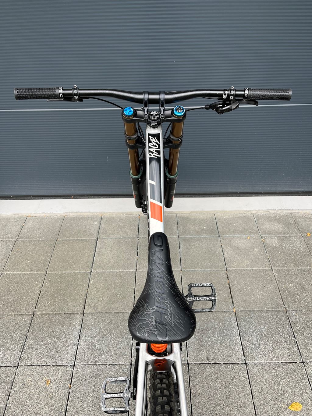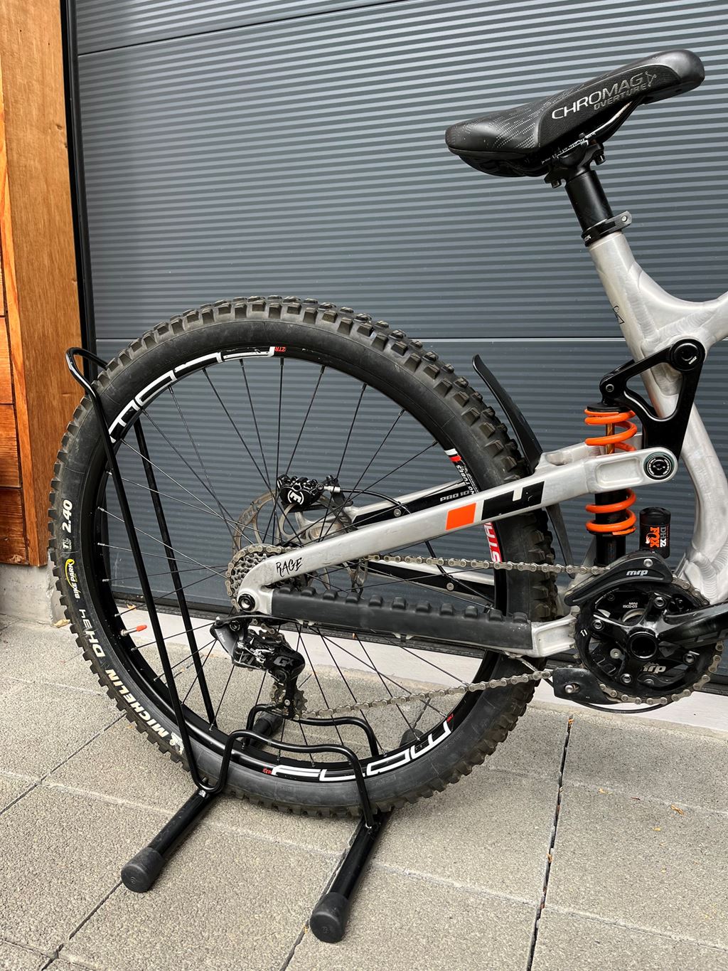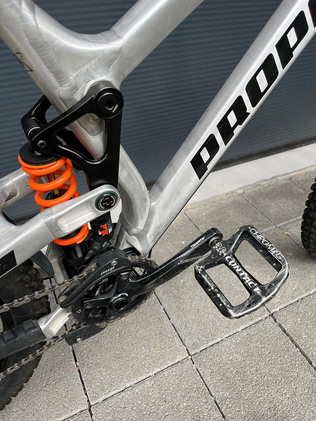 - Rahmen in Aluminium Raw, Bremsen Magura MT 5, Gabel Fox 40 Factory, Dämpfer Fox DHX2, Schaltung Sram GX 7 Speed, guter Zustand, normale Gebrauchsspuren