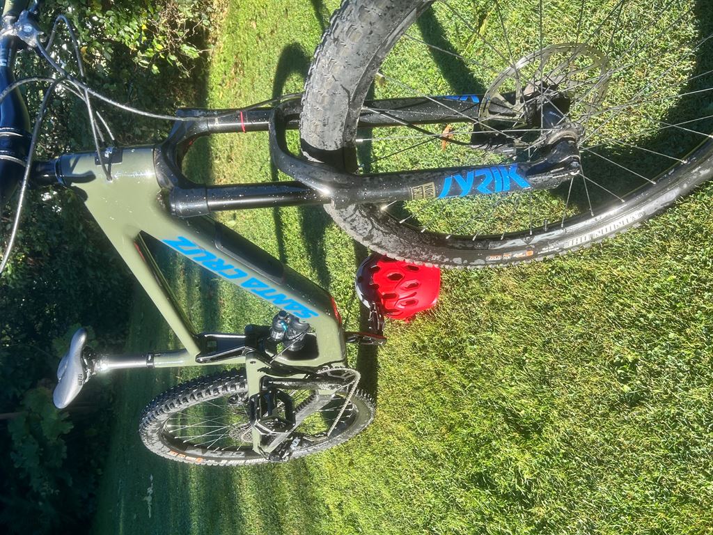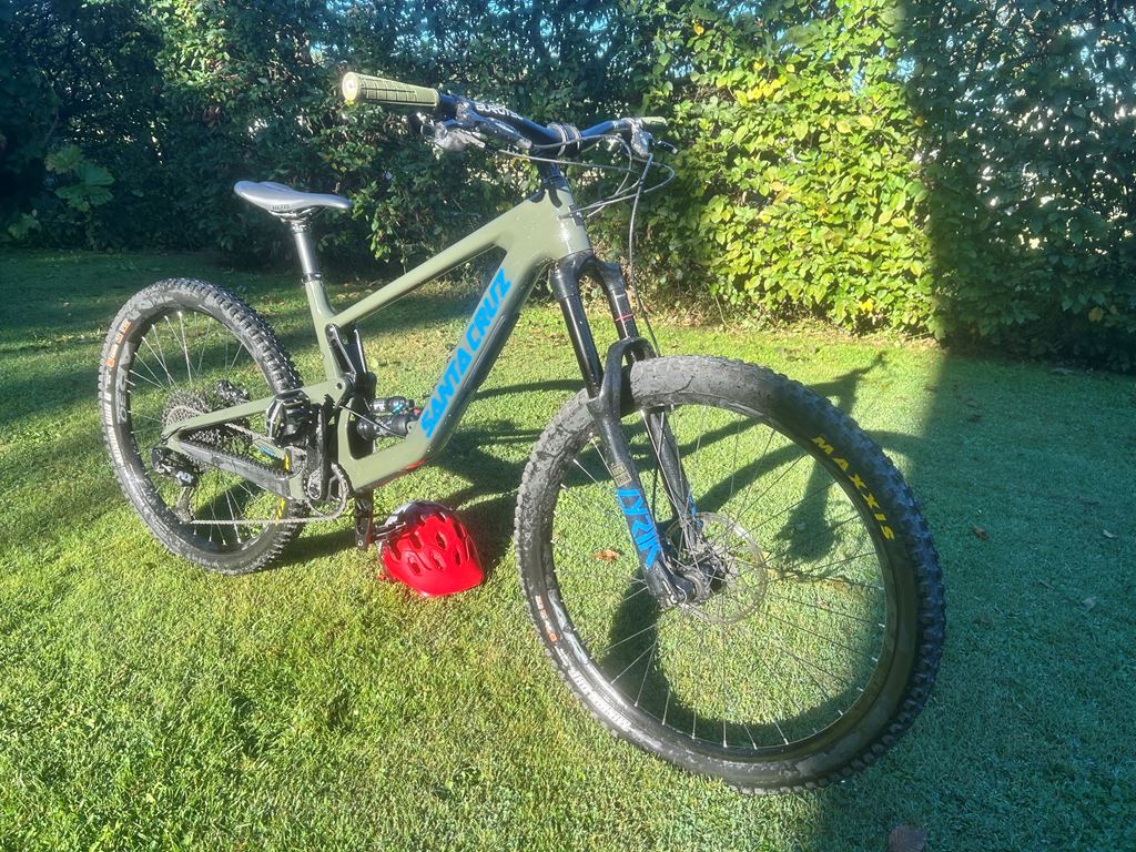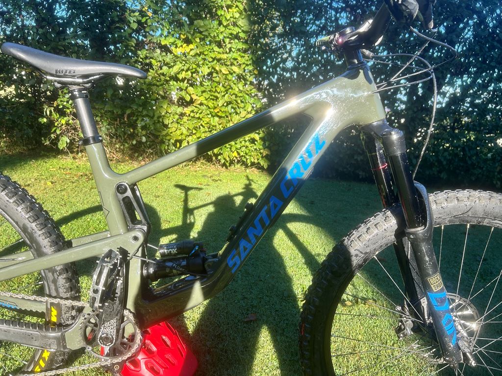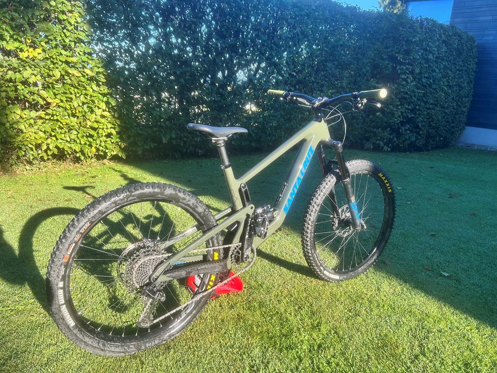 - Zum Verkauf steht mein Santa Cruz Bronson C R-Kit, Modelljahr 2022, in der seltenen Farbe Gloss Moss and Blue. Das Bike ist ein echtes All-Mountain/Freeride-Wunder mit 160 mm Federweg vorne und 150 mm hinten. Perfekt für Trails, Enduro-Touren und Bikepark-Tage. ✅ Details zum Bike: Modell: Santa Cruz Bronson C, R-Kit Modelljahr: 2022 Laufräder: MX (29" vorne / 27.5" hinten) Rahmenmaterial: Carbon C Farbe: Gloss Moss & Blue Federweg: 160 mm (Gabel) / 150 mm (Dämpfer) Schaltung: SRAM NX Eagle, 12-fach Bremsen: SRAM G2 R, 4-Kolben Dämpfer: RockShox Super Deluxe Select Gabel: RockShox Lyrik Base Laufräder: RaceFace AR Offset 30 Reifen: Maxxis Minion DHR II / Maxxis Minion DHF ✅ Zustand: Sehr gepflegt, kaum Kratzer, kein Bikepark-Einsatz Regelmäßig gereinigt und gewartet Lager in gutem Zustand, Schaltung sauber eingestellt Reifen, Bremsbeläge und Kette noch gut