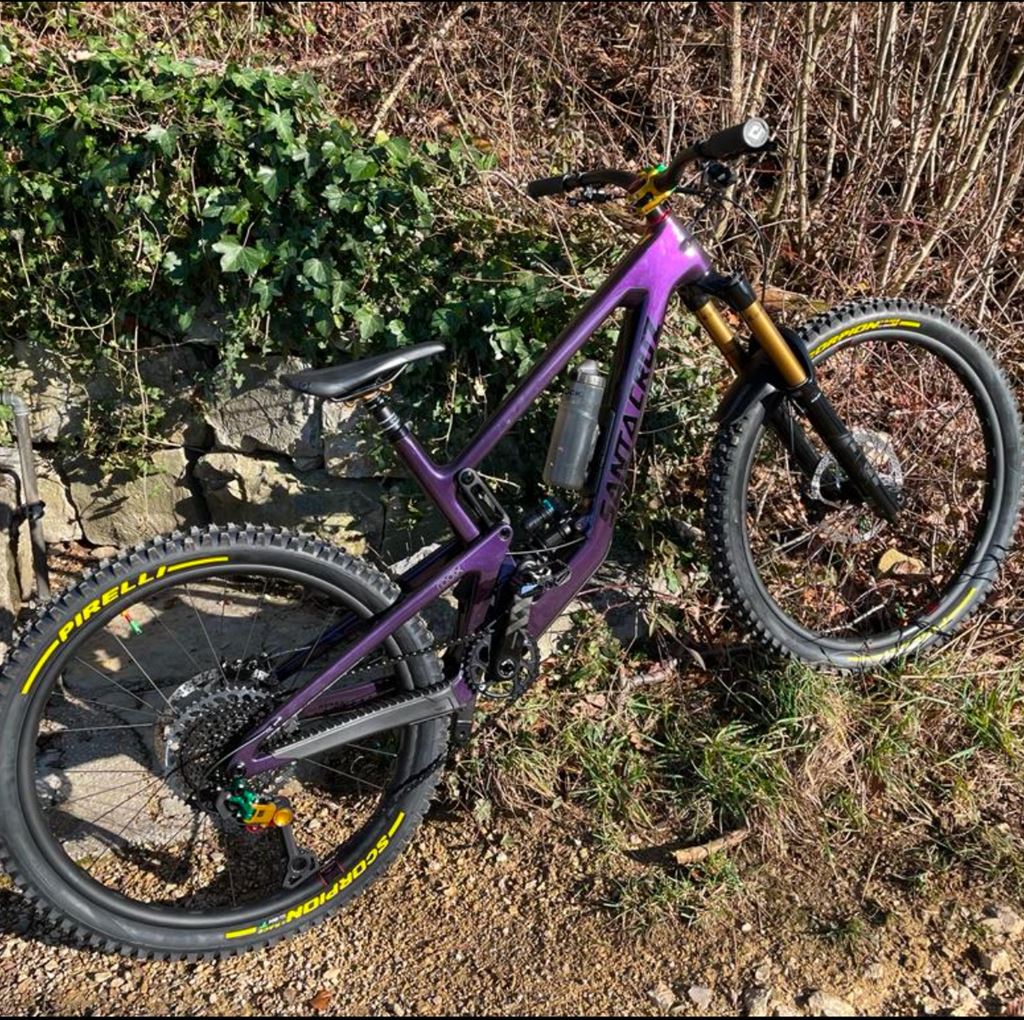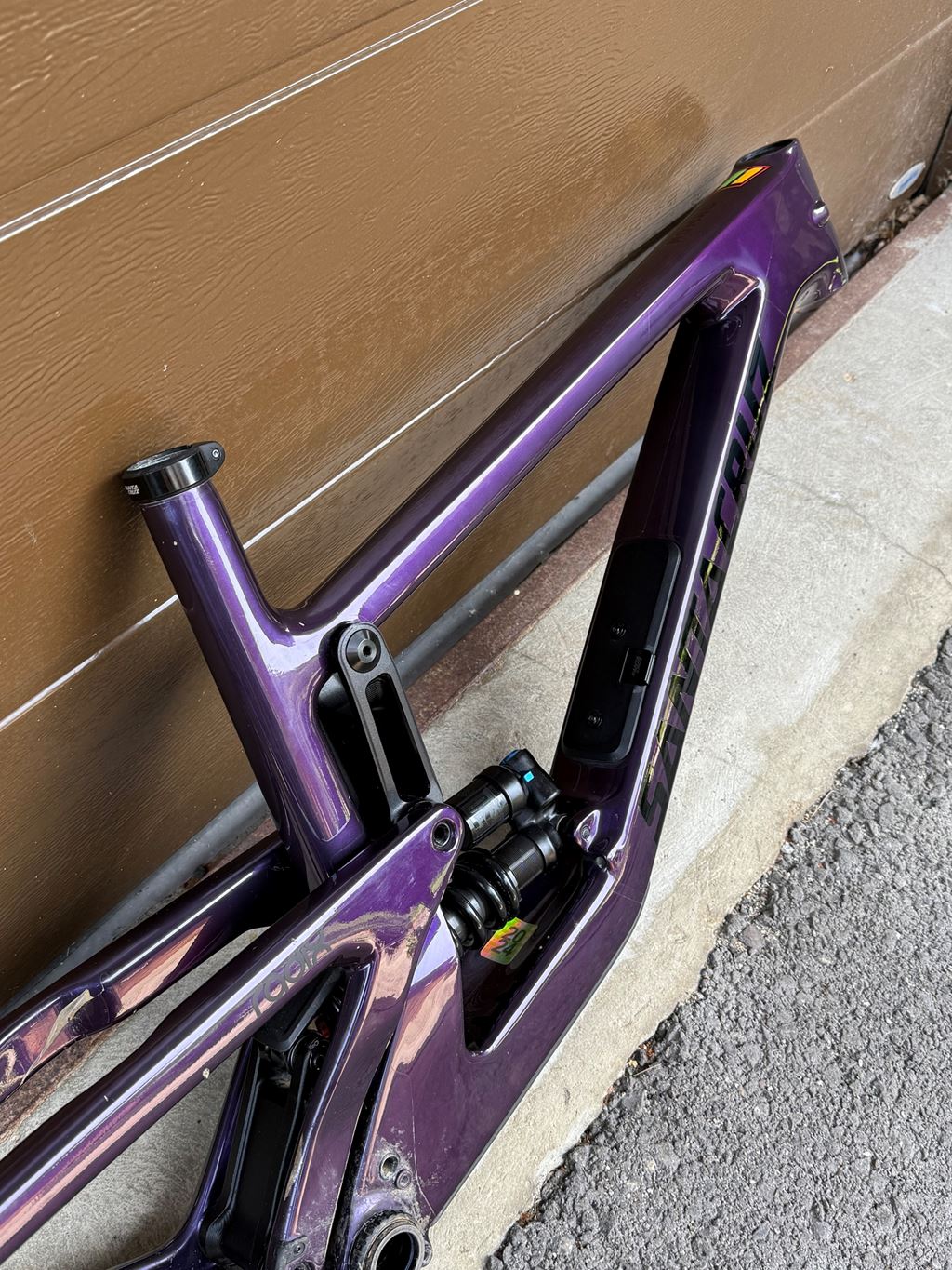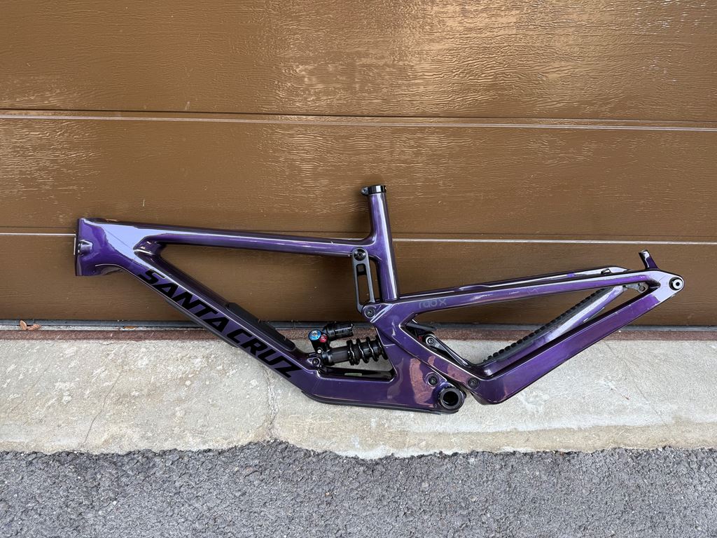 - Santa Cruz Nomad Rahmen CC von 2024 Hierbei handelt es sich um den Rahmen in der Grösse L ab grossem Service. Der Rahmen wurde professionell in der Farbe Viola HongKong Purple lackiert (Lackierer von Arc8) Alle Aufschriften sind schwarz oder dreifarbig lackiert. Der komplette Rahmen wurde mit einer Schlagschutzfolie beklebt, die Folie hat normale Gebrauchsspuren, schützt den Rahmen aber nach wie vor zuverlässig. Keine grossen Kratzer oder Beschädigungen. Diverse Teile sind inkl. Oder können dazu erworben werden. inkl. Fox Coil DHX2 inkl. Tretlager Sram Dub - Neuer Fox X2 Luftdämpfer (200.-) - Chrisking Steuerlagersatz rot (80.-) - Vorbau IndustrieNine Rastafarben (80.-) - Kurbeln XX1 Carbon 150.- - Ingrid rasta limited Wechsler 200.-
