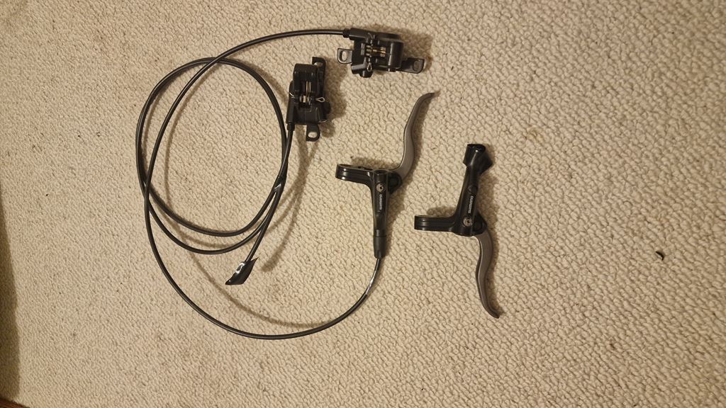 - Sehr guter Zustand! Bremsbeläge inbegriffen! 2x Bremshebel, 2x Bremssattel, 1x Bremsleitung vorne, 1x Bremsleitung hinten Die Entlüftungsschrauben sind etwas zerkratzt