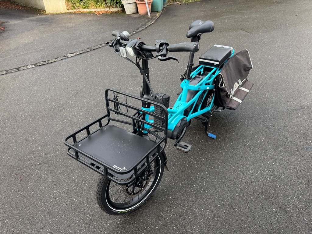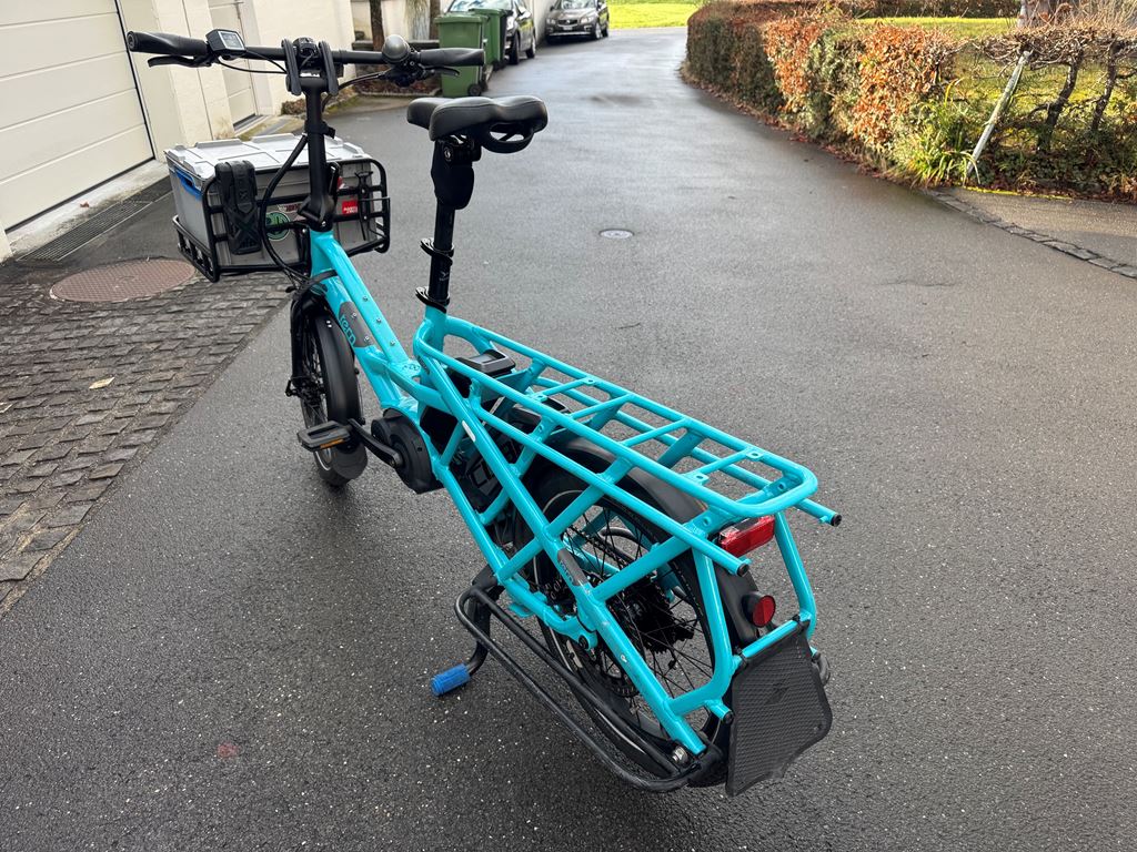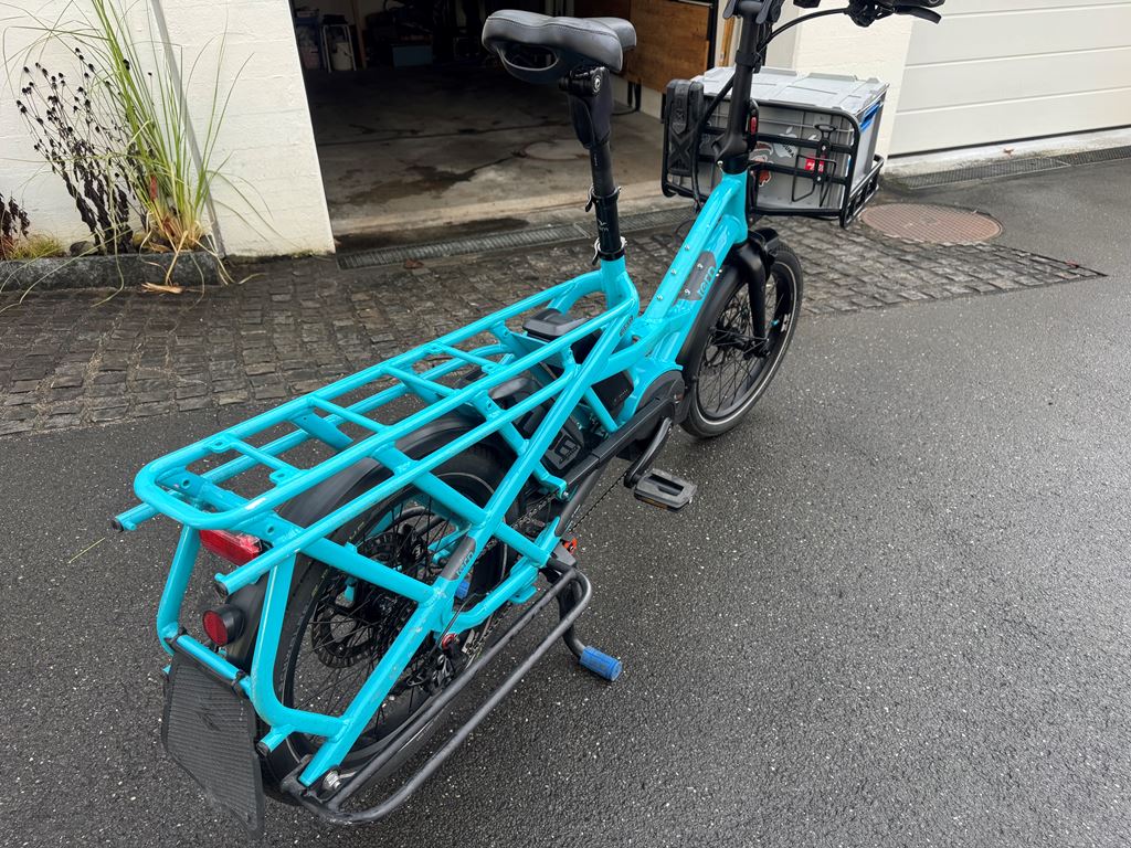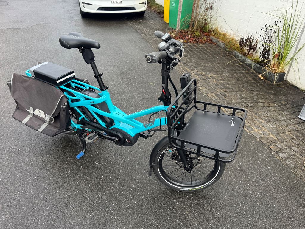 Ich verkaufe mein trues Tern GSD, erste Generation, mit viel Zubehör, da die Kinder nun gross genug sind, um selbst zu fahren. Gekauft wurde es im Juli 2018 in Deutschland, es ist also 7.5 Jahre alt und wurde ca. 8500km gefahren. Der originale Motor hatte Ende 2025 einen Schaden und wurde durch einen nagelneuen, originalen Bosch Motor ersetzt, der auch noch Garantie hat (bis April 2026). Es sind mehr als 1200.- (Neupreise) an Zusatzausstattung vorhanden plus der neue Motor. Ausstattungs-Highlights: - Shimano Zee Schaltwerk (unverwüstlich, sehr wartungsarm) - grosse MDR-P Scheibenbremsen - Atlas Ständer (wie bei den aktuellen GSD, viel stabiler als der originale) - Feder-Sattelstütze - nahezu neue Reifen Das Rad läuft wie am ersten Tag. Es stand immer im Keller oder Garage, effektiv hat es fast nie Regen gesehen und ich bin auch bei Regen kaum gefahren. Daher kein Rost oder ausgewaschene Lager. Ich habe beide Kinder vom Kindergarten bis in die Primarschule damit transportiert - zuerst mit 2 Yepp Maxi Sitzen, dann mit einem Yepp Junior, später nur noch mit dem Tern Seat Pad. Das Bike hat bei uns mindestens den Zweitwagen, oft das Auto komplett ersetzt und Einkäufe oder auch mal Material vom Baumarkt transportiert. Einige Kratzer und Lackschäden gibt es natürlich, vor allem im Gepäckbereich. Keine Beulen, Dellen oder Risse im Rahmen, es fährt wie am ersten Tag oder besser durch die Upgrades an Schaltung und Bremsen. Das Bike wurde stets gewartet (Bremsen vor 6 Monaten entlüftet und neue Beläge), Reifen ca. 1-jährig, Kette und Kassette ca. 3-jährig. Pneu sind ca. 200km gefahren. Derzeit besteht kein Bedarf für einen Service, als nächstes wäre maximal die Kette oder die Kassette fällig, aber diese halten geschätzt noch 1-2 Jahre. Da es keine Federgabel hat, muss man dort auch keine Wartung aller 1-2 Jahre machen - das ist ein grosser Vorteil, eine Wartung kostet ca. 200-300 CHF. Realistische Reichweite mit einem Akku im TURBO-Modus schätze ich auf 30-40km auf gerader Strecke, hier in den Bergen eher 25km. Mit zwei Akkus entsprechend doppelt so lange und im Sport- oder Eco-Modus natürlich viel weiter. Am Berg hilft aber nur Turbo. Kein Spiel im Headset, den Pedalen oder Radlagern, Sattelstütze war immer gut geschmiert und federt super. Räder laufen rund und eiern nicht. Bremsen ziehen gut, quietschen nicht. Die Sattelstütze ist frisch geschmiert und federt gut. Der Front-Gepäckträger hat ein paar Schrammen auf der Auflagefläche, da dort schon immer die Box drauf steht (kann man nur empfehlen). Die Box gebe ich . Ausstattung (Preise in Klammern waren meine Kosten - das ist alles im Preis enthalten!) - Neuer Bosch Performance Line Motor (Austausch nach Motorschaden), 23 km (500.-) - Sidekick Bars (70.-) - Sidekick Foot Pegs (25.-) - Sidekick Lower Decks (65.-) - Sidekick Seat Pad (50.-) - Transporteur Rack (175.-) - 2 Akkus (4000km und 3000km) (200.-) - Abus Rahmenschloss (30.-) - Abus Gelenkschloss (80.-) - Atlas Zweibeinständer (50.-) - Suntour NCX Feder-Sattelstütze (120.-) - 1 neue Transportbox vorn, halbe Höhe mit Deckel (20,-) - 1 Transportbox vorn, ca 7 jährig - 2 original Pannier Bags - Schmutzfänger - keine Federgabel (daher auch kein Service nötig!) - Magura MT-5 Bremsen mit MDR-P Scheiben (die nicht klappern) 220mm vorn, 203mm hinten (100.-) - Shimano Zee 10-fach Schaltwerk: unverwüstlich, praktisch keine Einstellung in den letzten 5 Jahren (50.-) - fast neue Schwalbe Reifen, ca. 200km gefahren, "E Pick-Up 50 Cargo-Ready, Addix 8, 125kg max load, 60-406 (20x2.35), Reflektor-Streifen (50.-) - original-Beleuchtung, Front-Rückstrahler, Hupe - Rahmenfolie ab Werk ist noch drauf - alle Schlüssel vorhanden - alle Anleitungen vorhanden Die weissen Ortlieb-Taschen können ggf. extra gekauft werden. Eine Ricardo Auktion läuft ebenfalls - schaut da auch mal rein! Das Rad kann gern im Meggen angeschaut und probegefahren werden.