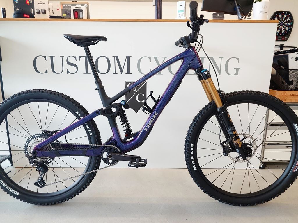 - Custom Cycling Aarauerstrasse 11b 5018 Erlinsbach 062 525 95 44 Rahmen OCLV Mountain Carbon, internal storage, ZS headset, adjustable leverage rate, guided internal routing, interchangeable alloy rocker link, interchangeable lower shock mount, downtube guard, shuttle guard, BSA 73, ISCG 05, ABP, UDH, Boost148, adaptable travel 145mm-160mm Gabel FOX Factory 38, Float EVOL Luftfeder, GRIP X2 Dämpfung, 44 mm Vorlauf, Boost110, 15 mm Kabolt X Achse, 170 mm Federweg Dämpfer FOX DHX2, 205 x 65 mm *Federungsersatzteil Größe: S FOX Stahlfeder, 250 Pfund Größe: M FOX Stahlfeder, 350 Pfund Größe: L FOX Stahlfeder, 400 Pfund Größe: XL FOX Stahlfeder, 450 Pfund Größe: XXL Fox steel coil spring, 500 lbs Laufräder Vorderrad Bontrager Line Comp 30, Tubeless-Ready, 6-Loch-Scheibenaufnahme, Boost110, 15 mm Steckachse, 29" Hinterrad Bontrager Line Comp 30, Tubeless Ready, Rapid Drive 108, 6-Loch-Scheibenaufnahme, Shimano Micro Spline Freilaufnabe, Boost148, 12 mm Steckachse, 29" HR-Schnellspanner Bontrager Switch Steckachse, abnehmbarer Hebel *Reifen Größe: S, XL, L, M, XXL Maxxis Assegai, Tubeless-Ready, 3C, EXO+ Karkasse, MAXXGRIP, faltbarer Wulstkern, 29 x 2.50 Größe: S, XL, L, M, XXL Maxxis Minion DHR II, Tubeless-Ready, 3C, EXO+ Karkasse, MAXXTERRA, faltbarer Wulstkern, 29 x 2.50 Reifen-Ersatzteil Bontrager TLR-Dichtmittel, 177 ml Max. Reifengröße Rahmen: 29 x 2.50", Gabel: siehe Hersteller Antrieb Schalthebel Shimano XT M8100, 12fach Schaltwerk Shimano XT M8100, langer Käfig Kurbel Shimano XT M8120, 30 Z., 55 mm Kettenlinie, 170 mm Kurbelarmlänge Tretlager Shimano BB-MT501, BSA-Gewinde Kassette Shimano XT M8200, 10-51 Z., 12fach Kette Shimano Ultegra/XT M8100, 12fach Max. Kettenblattgröße Max.: 34 Zähne (oval – 32 Zähne) Min.: 30 Zähne (oval – 32 Zähne) Komponenten Sattel Verse Short Pro, Carbonstreben, 145 mm Breite *Sattelstütze Größe: S Bontrager Line Dropper, 150 mm Hub, MaxFlow, interne Zugführung, 34,9 mm, 410 mm Länge Größe: M Bontrager Line Dropper, 170 mm Hub, MaxFlow, interne Zugführung, 34,9 mm, 450 mm Länge Größe: XL, L, XXL Bontrager Line Dropper, 200 mm Hub, MaxFlow, interne Zugführung, 34,9 mm, 515 mm Länge Lenker Race Face ERA, Carbon, 35 mm, 27,5 mm Rise, 800 mm Breite Griffe Trek Line Elite, Schraubklemmung Vorbau Bontrager Elite, 35 mm, 0 Grad, 45 mm Länge Bremse Shimano XT M8200, hydraulische 4-Kolben-Scheibenbremse *Bremsscheibe Größe: S, XL, L, M, XXL Shimano RT86, 6-Loch-Scheibenaufnahme, 203 mm Größe: S, XL, L, M, XXL Shimano RT86, 6-Loch-Scheibenaufnahme, 180 mm Bremsscheibendurchmesser Max. Bremsscheibendurchmesser: Rahmen: 203 mm (min. 180 mm), Gabel: siehe Herstellerangaben