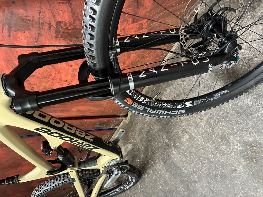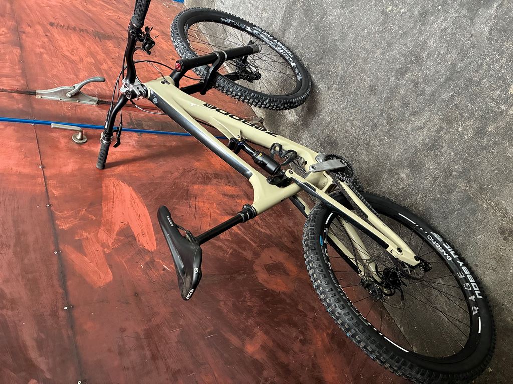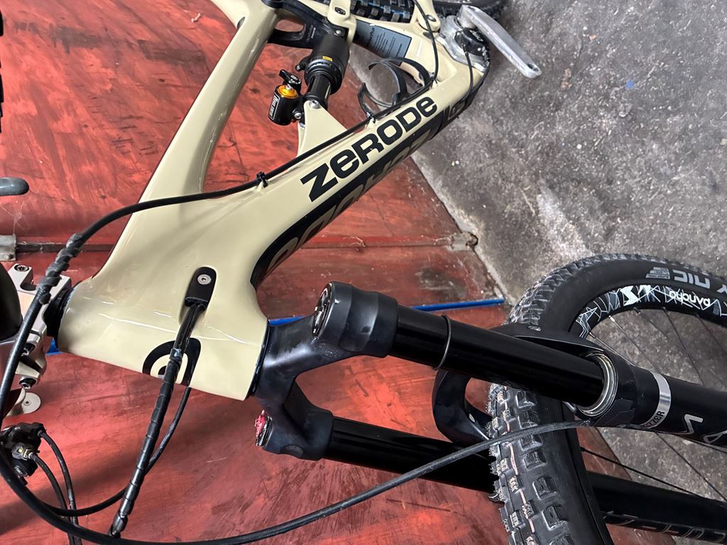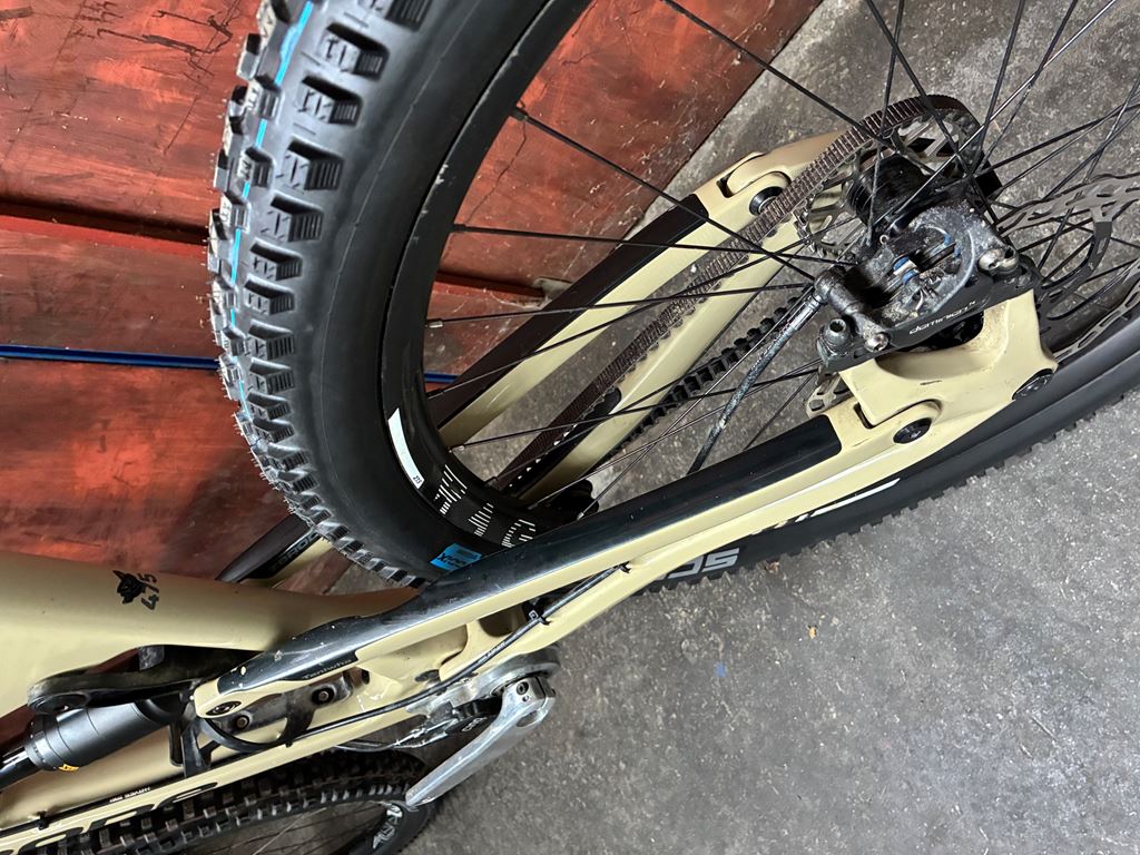 - Verkaufe hier mein Zerode Taniwha Mullet Enduro mit der Farbgebung "Clay", Grösse L (Reach 475mm). Spezifikation: - Rahmen: Zerode Taniwha Mullet Enduro 475mm Reach - Gabel: Manitou Mezzer Pro, 160mm, 44mm Offset - Dämpfer: Öhlins TTX2 Air, 210x55mm - VR: Pancho Vibe 29'', Reifen: Schwalbe Nobby Nic - HR: Pancho Rage 27.5'', Reifen: Schwalbe Nobby Nic - Antrieb: Pinion C1.12 Getriebe mit 12 Gängen mit 600% Übersetzungsbandbreite - Schaltung: Instinctive Cinq Schalthebel - Bremsanlage: Hayes Dominion A4 VO+HI - Gates Riemen - Sonstiges: -- Bremsscheiben: Galfer 203mm VO+HI -- Kurbel: Pinion Kurbelarme 175mm -- TAG Metals Sattelstütze und Lenker -- Ergon Griff und Sattel Keine Ahnung, warum es hier alle Bilder auf die Seite stellt. Ihr könnt Euch gerne melden, dann schicke ich Euch die Originalbilder - aufrecht =) Das Bike war ca. 14 Monate im Einsatz. Der Rahmen blieb in dieser Zeit leider nicht vor Lackabplatzer verschont; aber das gehört leider zu diesem Sport. Mir sind keine Mängel oder Schäden am Rahmen oder den Anbauteilen bekannt. Die Laufräder laufen rund und einwandfrei und das Pinion macht seine Arbeit. Das Bike ist aktuell bei ca. 3500 km Laufleistung. Die Leitungsführung bei der Gabel fehlt leider, da die Verschraubung kaputt ist. Die Befestigung mit dem Elektrikerband hält jedoch seit 2 Monaten ohne grosse Probleme. Ich habe das Bike immer gehegt und gepflegt. Vor einem Monat habe ich alle Lager geserviced. Der letzte kleine Service bei der Gabel war vorgestern. Der letzte grosse Service von der Gabel war vor 4 Monaten. Der Dämpfer hat noch keinen Service gesehen. Die Rahmen-Originalrechnung ist vorhanden (Kaufdatum 10.06.2024).